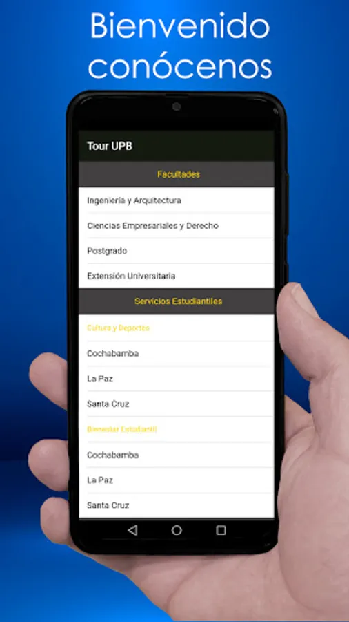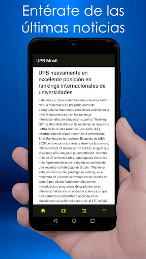 The app provides essential information of the Bolivian Private University, the UPB-Mobile Application displays the latest in three sections: Research, Academic and Events. The application is aimed at the general public who want to learn more about our institution. Enables authentication functionality added by our students, teachers and parents as: