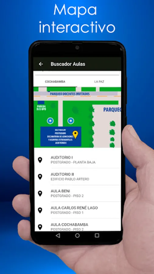 - Search Classrooms: interactive map of the 2 campuses in Cochabamba and La Paz