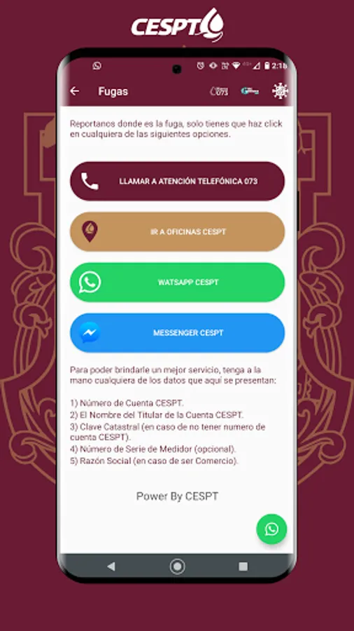 The TIJUANA STATE COMMISSION OF PUBLIC SERVICES (CESPT) offers its users the CESPT application. We include several useful options regarding your water service, mainly highlighting the detailed consultation of the bill, online payment and the report of leaks or lack of water with photography and georeferencing direct contact to our social networks and QR reader to pay for water .