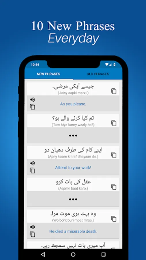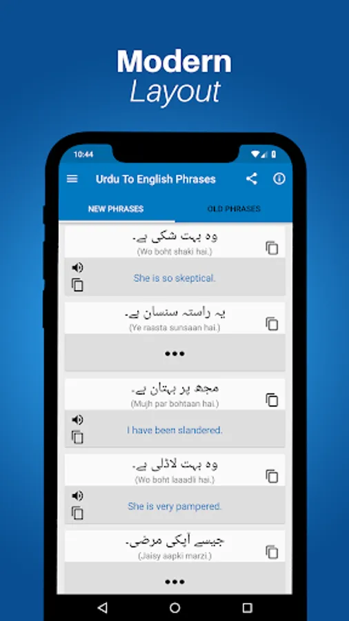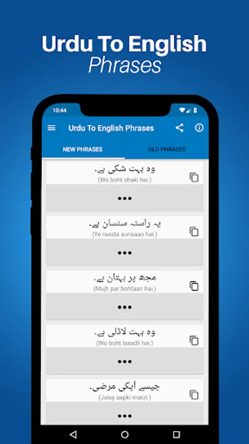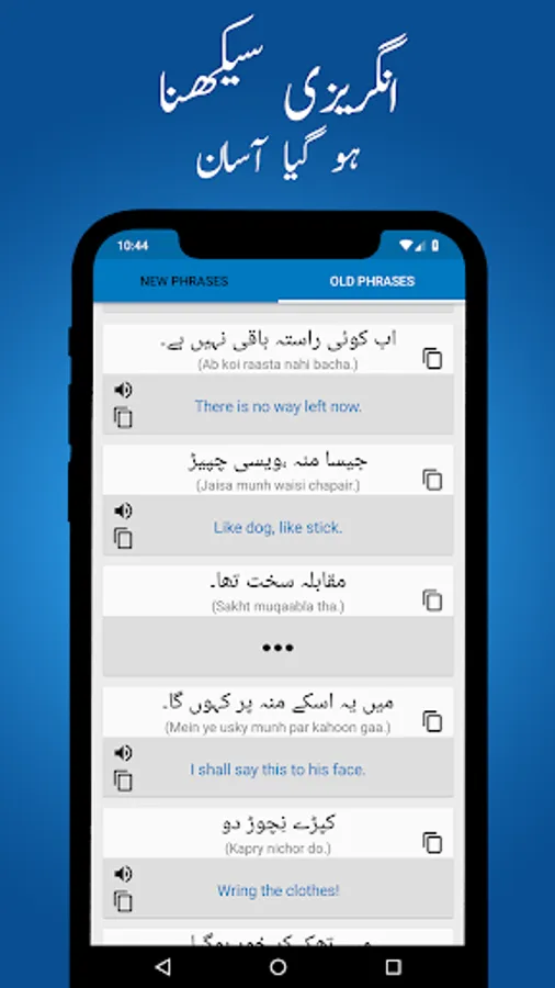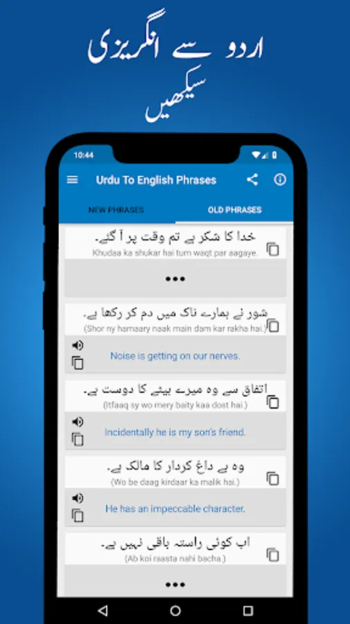 Urdu to English phrases for free. Learn Urdu to English translation from our app. New phrases daily and get better at speaking English day by day. How can you benefit from our application? You will be able to speak English better, get better in Urdu poetry, Urdu news, Urdu shayari love and much more. Urdu to English app’s phrases are extracted from Urdu quotes, Urdu funny shayari and Urdu dictionary. By using this Urdu To English learning app for free you will be to do Urdu to English conversation without hesitation. Many Urdu to English translation to share with your friends. You will get Urdu to English sentence translation as well as Urdu to English roman translation. One of the best Urdu to English vocabulary app has huge collection of Urdu to English translations. Urdu to English converter app allows you to learn in English in a fun way.