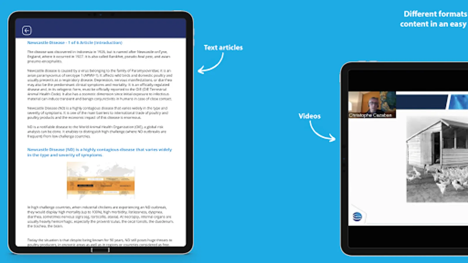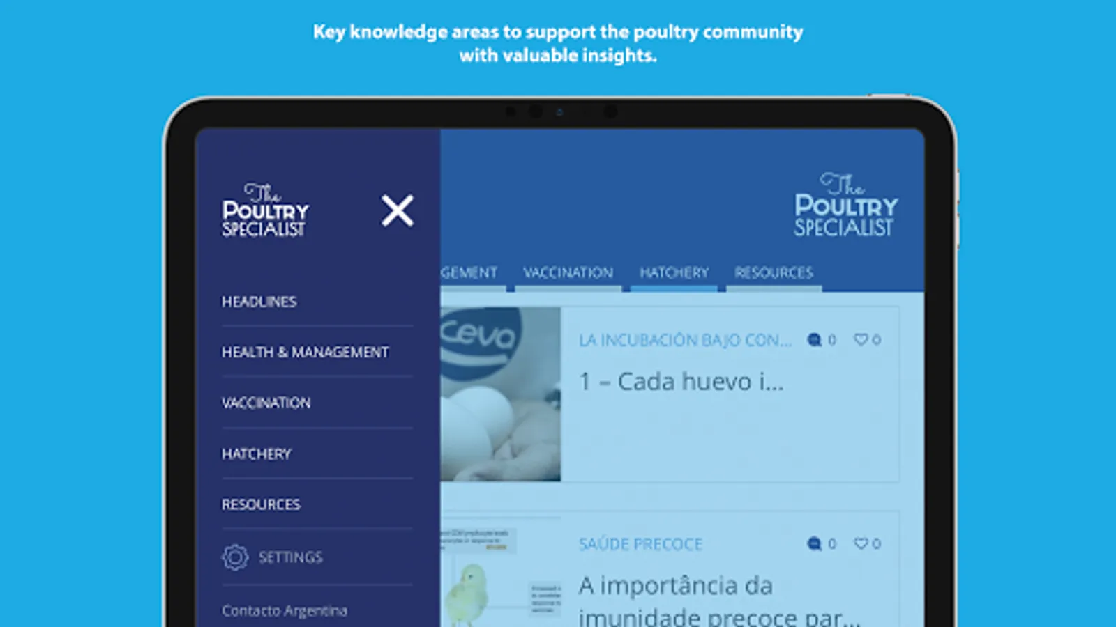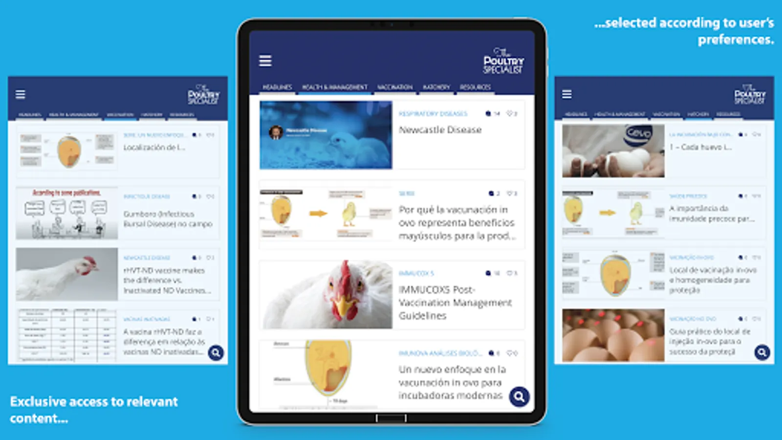 The content has been developed in text, audio and/or video formats to provide a fully immersive experience in various key topics and issues that the poultry industry has to face, such as disease prevention, epidemiologic threats, disease control, vaccination services, hatchery equipment, field monitoring and many more.