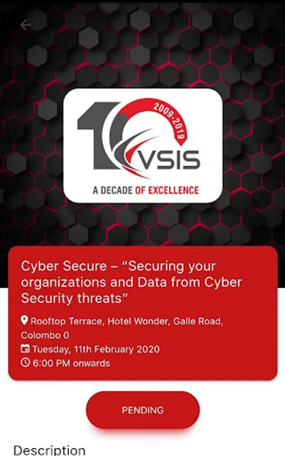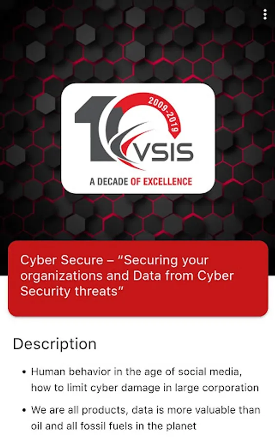 VSIS Event is a mobile based application developed to manage the end to end process from sending invitation to participants to managing attendants of "Cyber Secure - Securing your organisation & Data from Cyber security threats" event