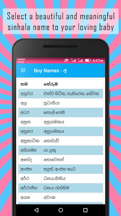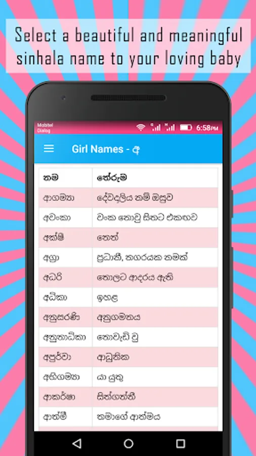 Sinhala Baby Names | Babata Namak android app contains beautiful and meaningful baby names for your newly born child. This app will help you to pick the best name which suits for your baby by examine its meaning.