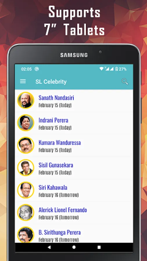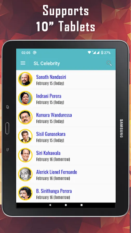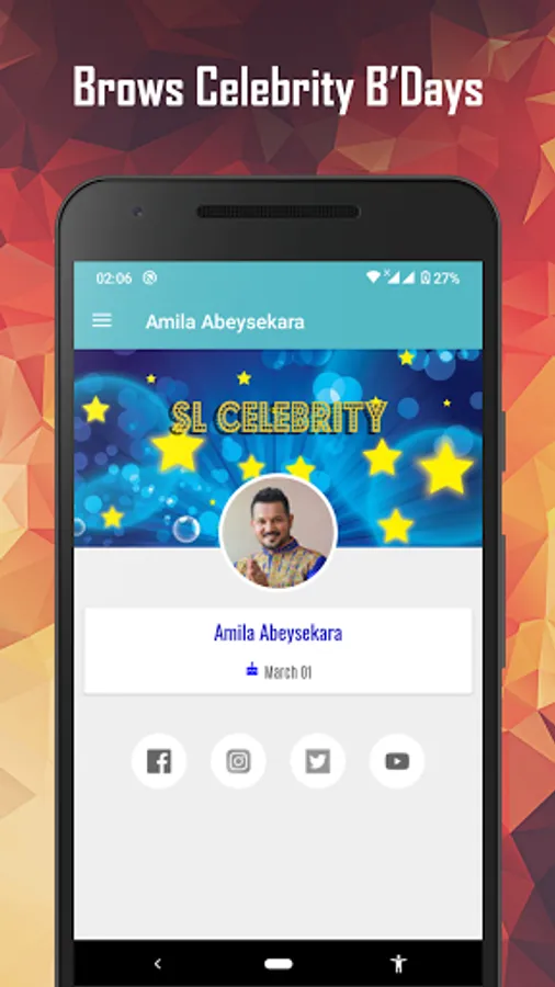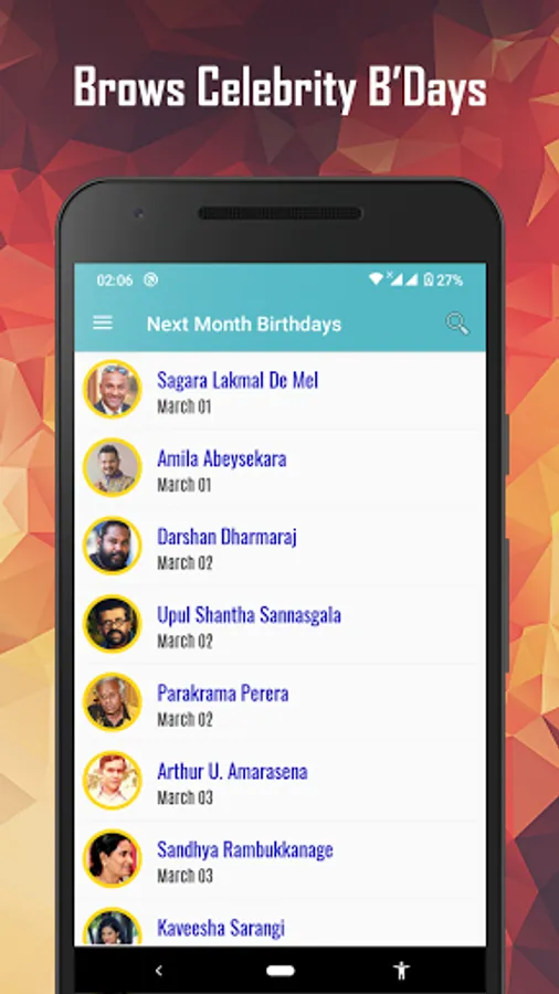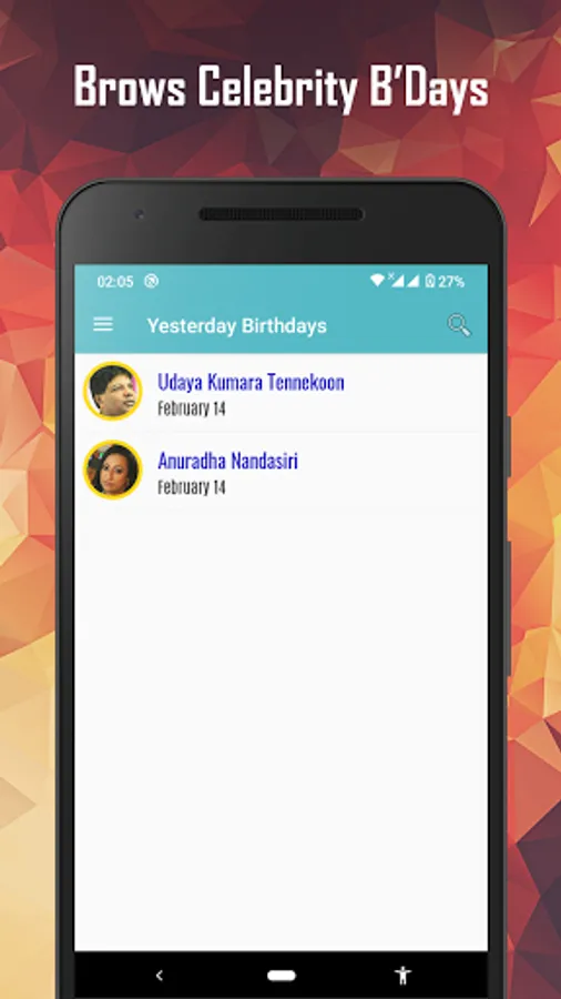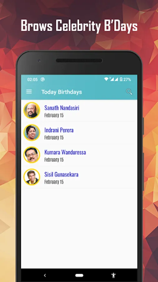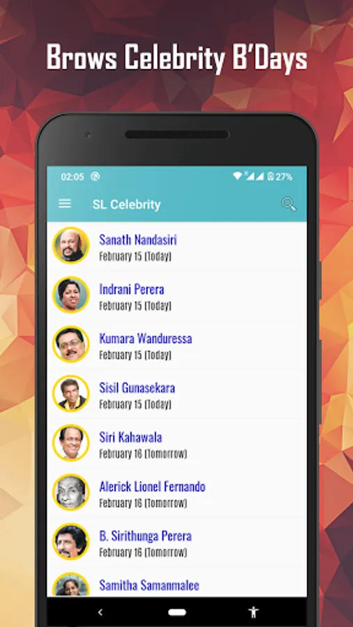 This app features birthdays of today's popular Sri Lankan celebrities including actors, singers, musicians etc. App will notify you regarding upcoming birthdays and you can search birthdays of your favorite celebrities.