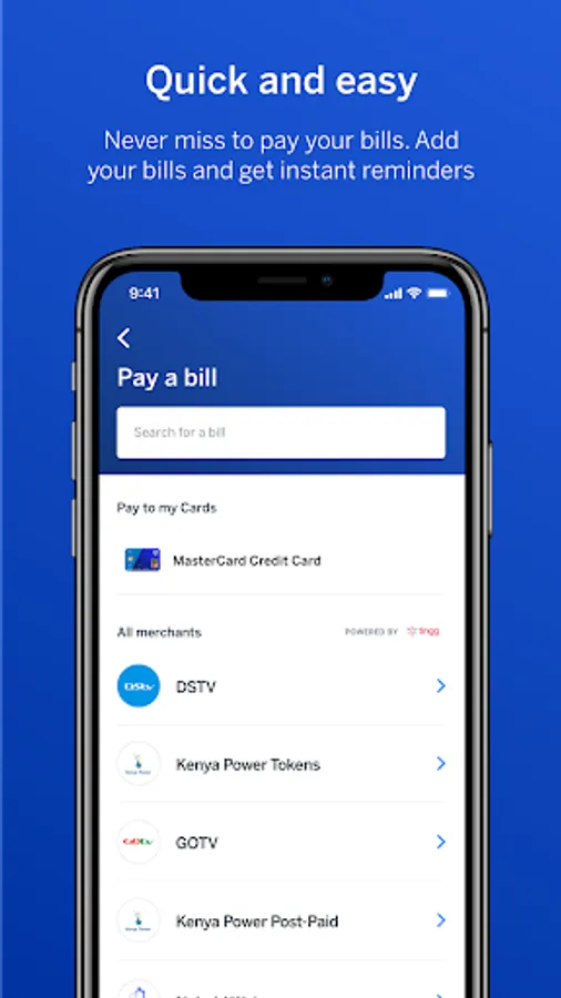 - Bill payments for Credit Card, DStv, GoTV, ZUKU, JamboJet, Kenya Power Prepaid tokens, Kenya Power Postpaid bill and Nairobi Water.