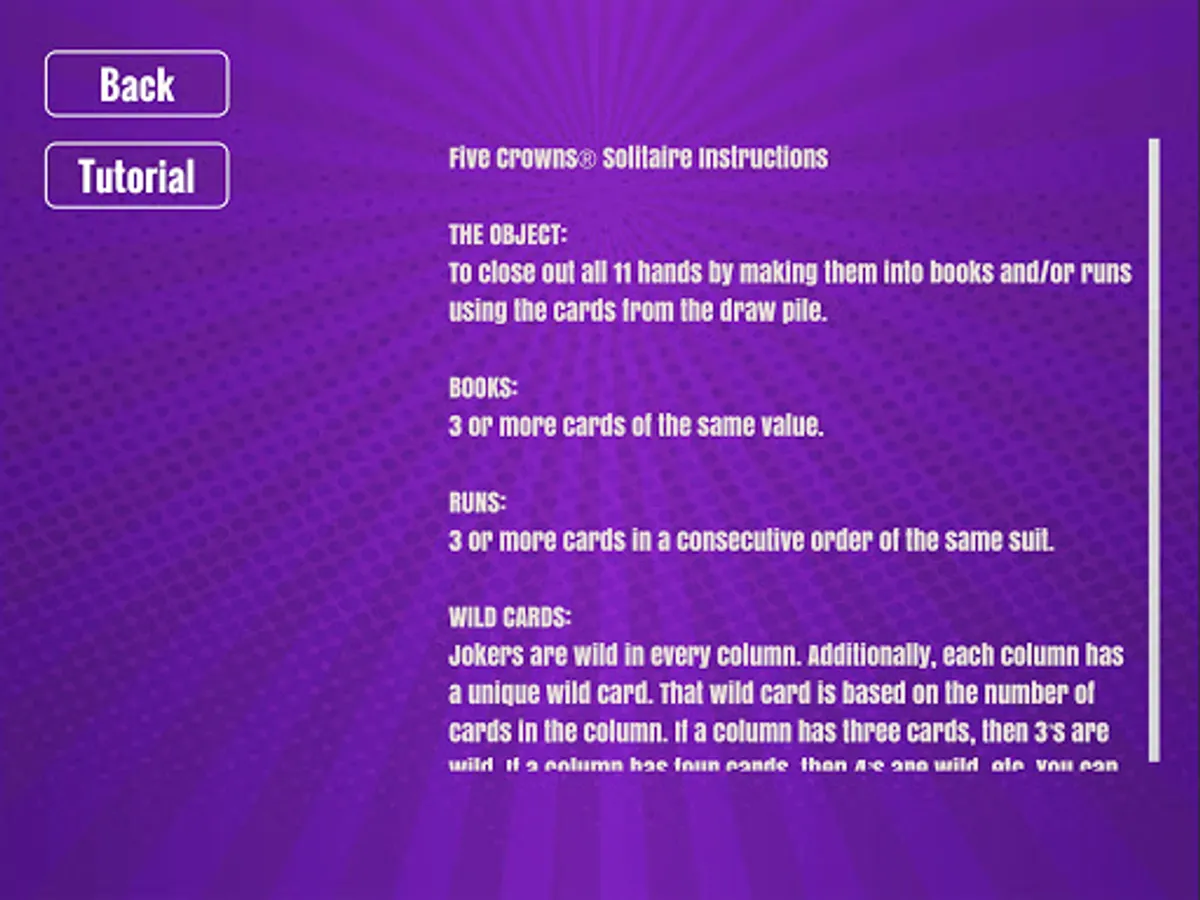 All eleven hands are dealt out in a traditional solitaire fashion where the first column has 3 cards, the next column has 4 cards, the next column 5 cards and so on until 11 columns are visually displayed to represents the 11 hands that is played in the multi-player version of Five Crowns.
