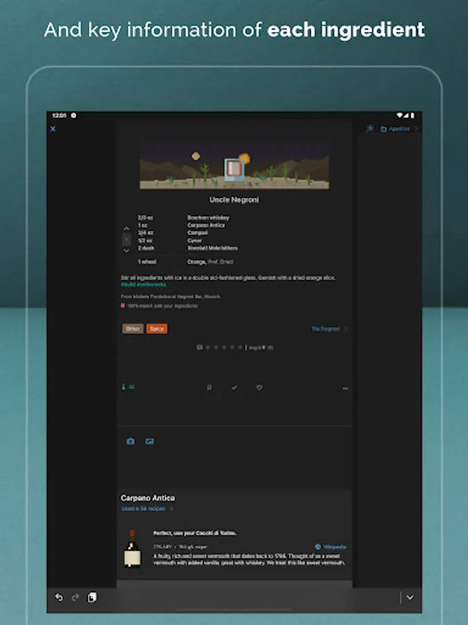 • Tap an ingredient and get the essential information including history, ABV%, sugar content, and a web link for more information.