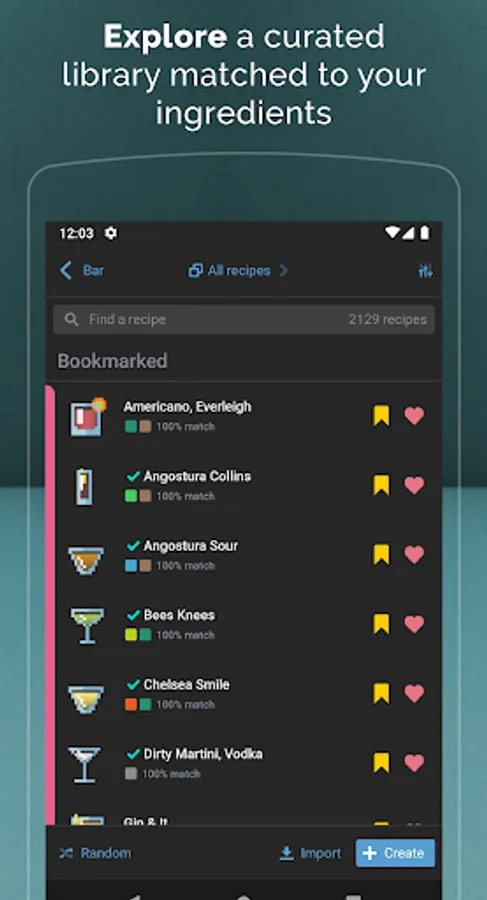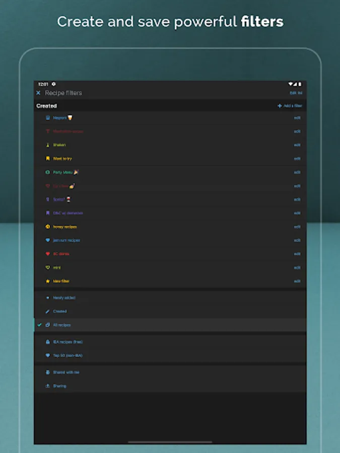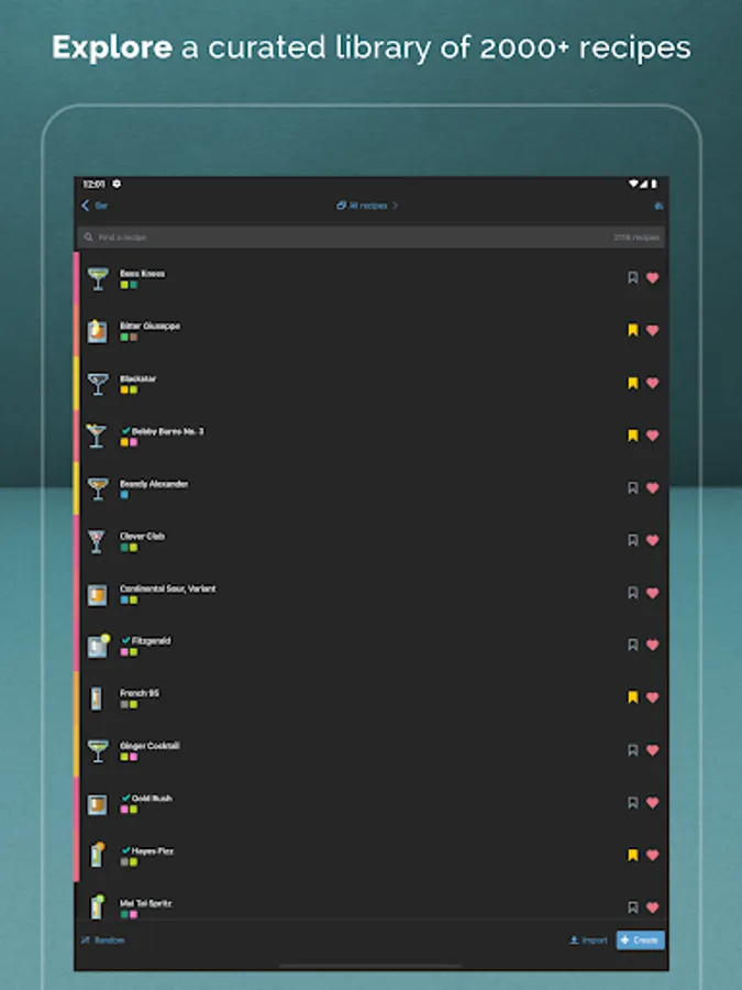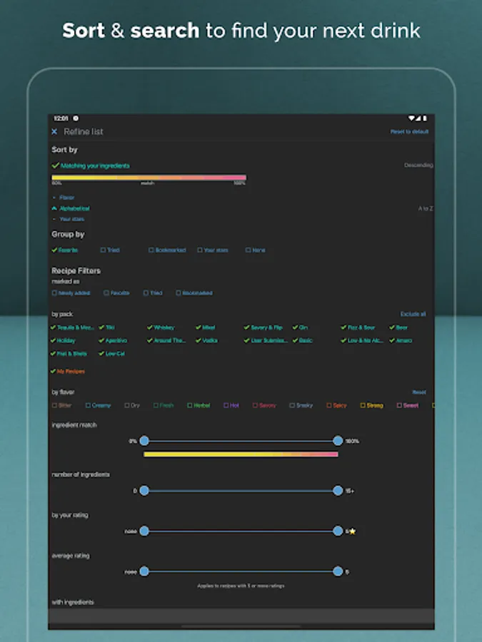 • Basic filters and sorting to find the perfect cocktails. All filters you create are synced to the cloud and available anywhere. Filter by flavor, recipe pack, favorite, tried, or bookmarked.