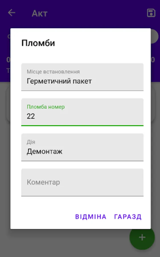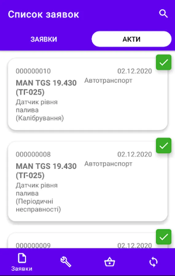 Acts are created on the basis of service requests. The equipment maintenance report reflects the used goods and materials, equipment and seals. The performed maintenance actions are indicated: installation, dismantling, repair, inspection.