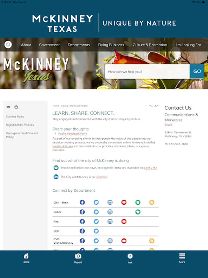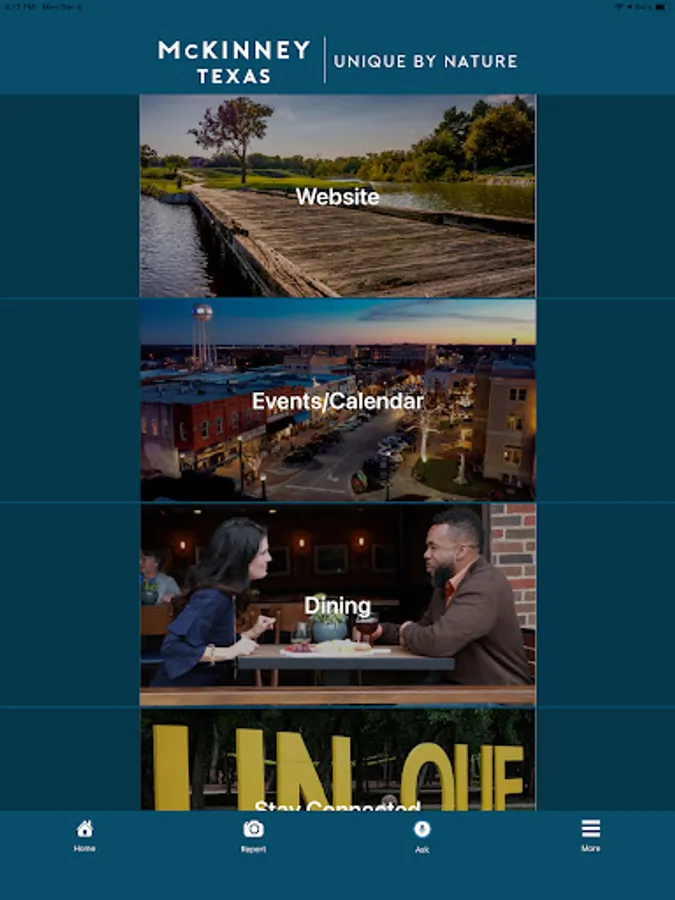The McKinney, Texas app is for anyone who lives in or visits McKinney, Texas. The app allows users to report issues to the city by just snapping a picture with your smartphone and submitting it for review. Also, users can search and view specific restaurants and businesses, view city events and link you to the most common pages on the city’s website