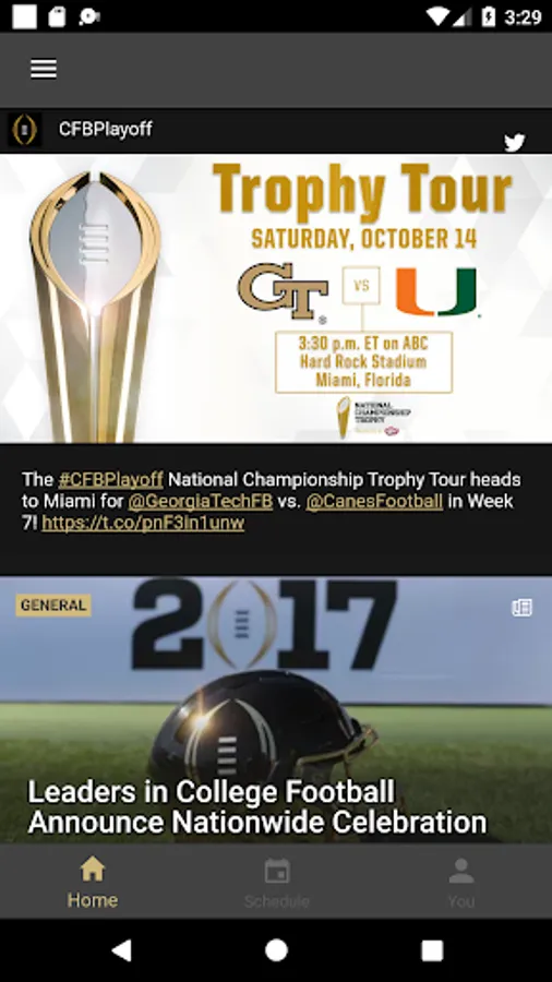 The College Football Playoff is the postseason format that determines the national champion for FBS college football. The playoff was created to preserve the excitement and significance of college football’s unique regular season where every game counts. Follow the excitement by downloading CFBPlayoff, the official app of the College Football Playoff.