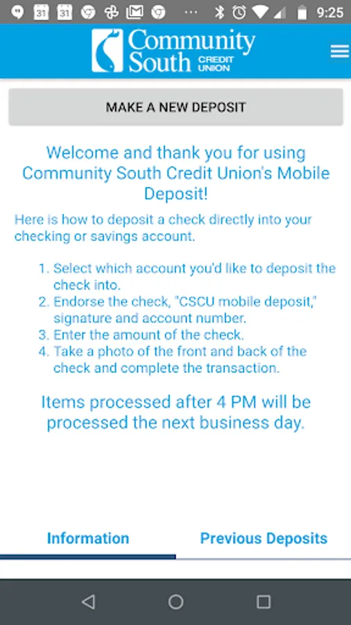Community South Credit Union knows that you have a busy schedule. We are making business a little easier for you by offering mobile remote deposit with the CS Remote Deposit app.