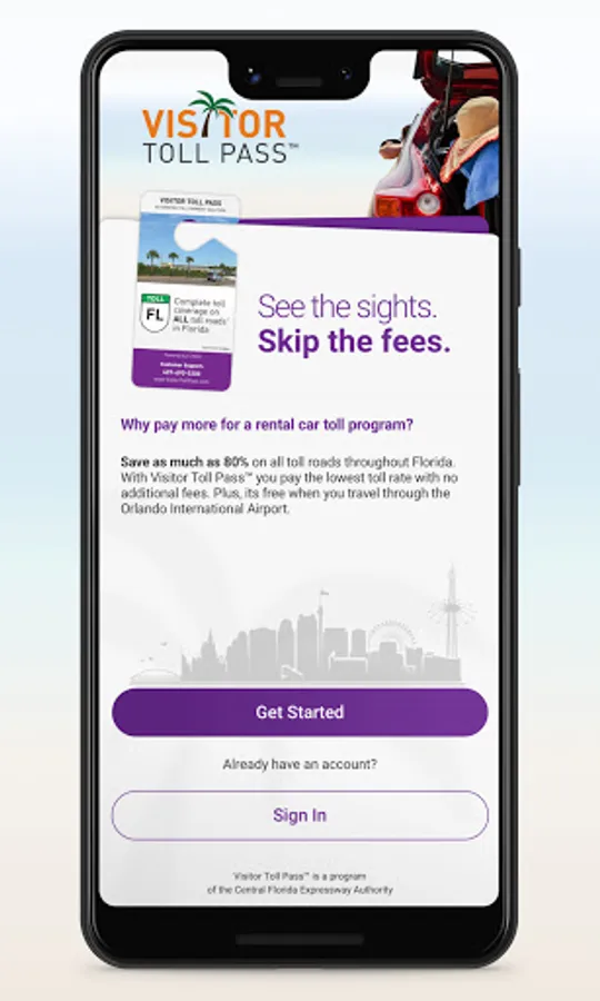 Visitor Toll Pass is a free, temporary toll pass for rental car customers traveling roundtrip through the Orlando International Airport. Simply download the app to reserve Visitor Toll Pass and save as much as 80% on tolls by skipping costly rental car toll fees while paying the lowest toll rate throughout Florida.