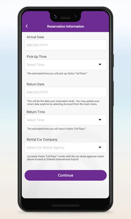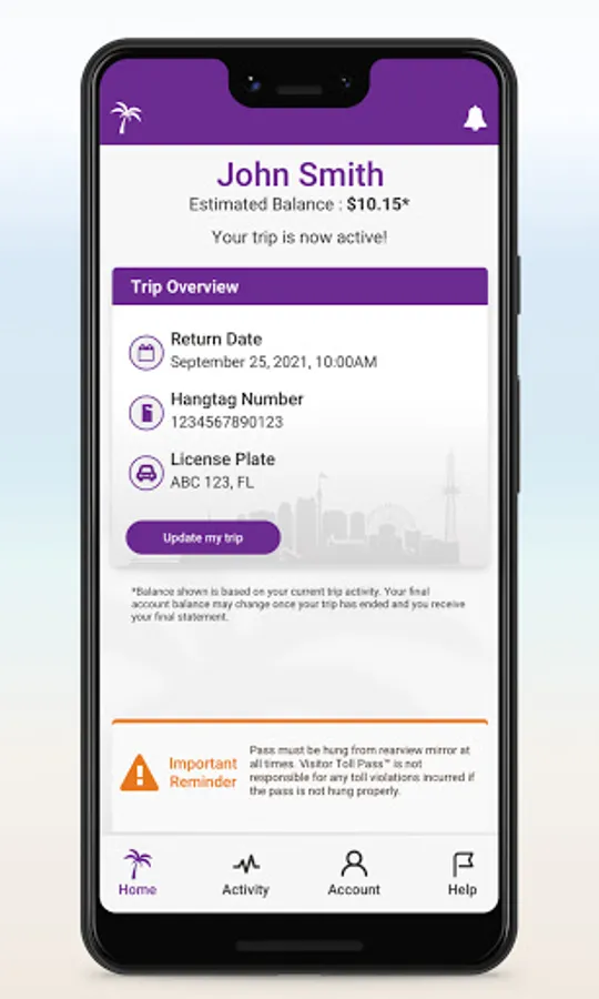 Upon arrival, follow in-app instructions to pick up your pass at vending machines located on Level I of Orlando International Airport. Use Visitor Toll Pass to pay tolls electronically and monitor activity using the app in real-time. At the conclusion of your trip, simply return the pass in drop boxes located throughout the airport. This service is currently only for visitors traveling roundtrip through the Orlando International Airport.