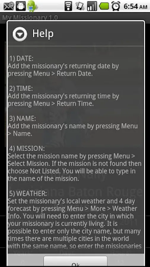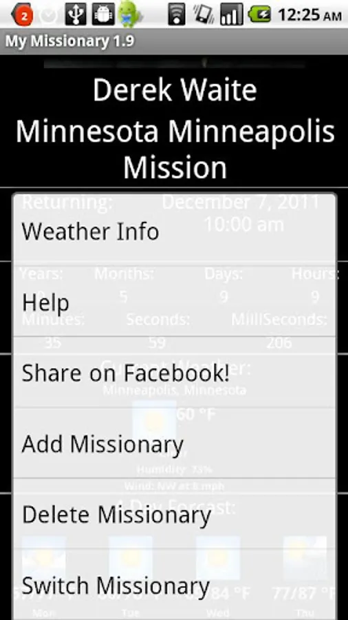 Select the mission, picture, name, return date and time, and current city and state, or city and country, and you'll get see in real-time stats on your missionaries. You can track multiple missionaries as well. Use the context menu button to access the menu items. You can also share the details on Facebook!