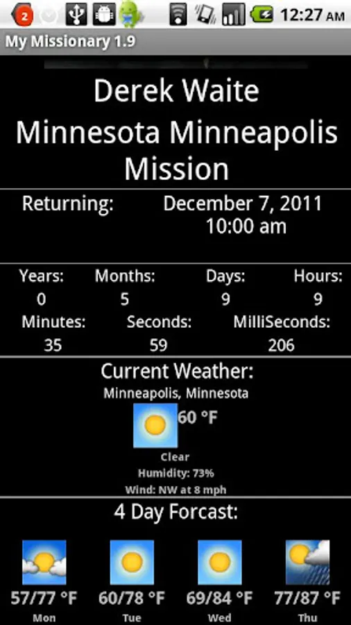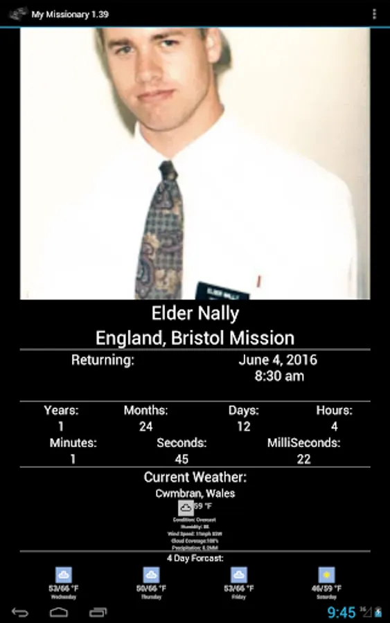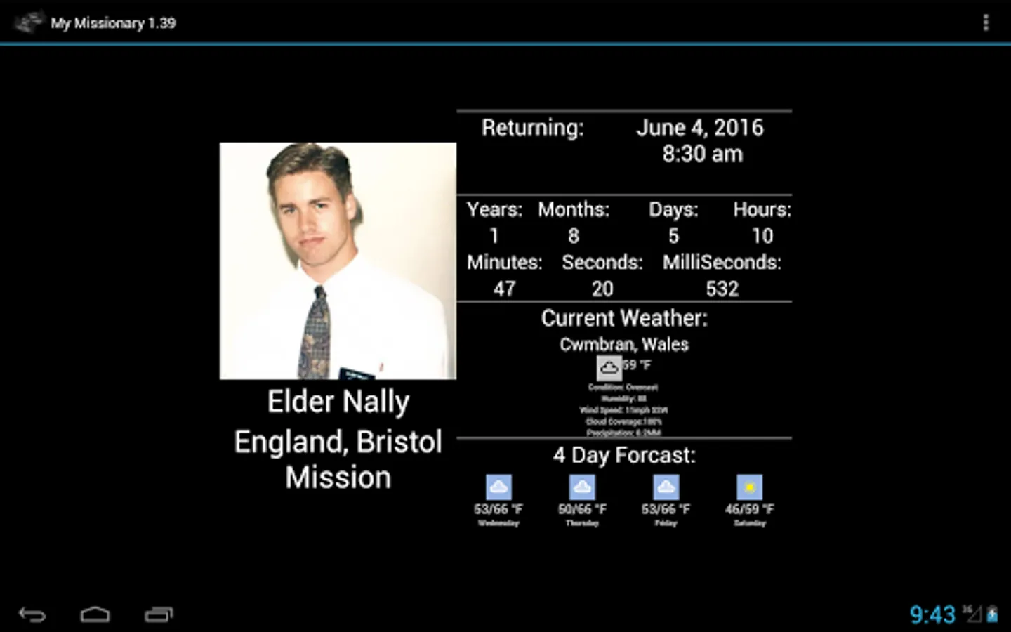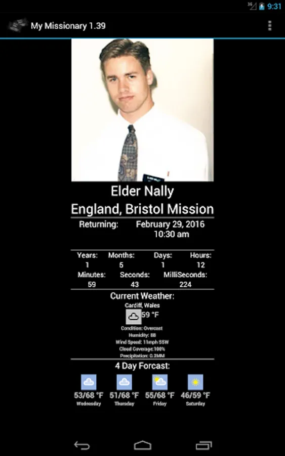 My Missionary lets you track when ALL your LDS / Mormon missionaries will be returning, down to the millisecond, and local weather information including a 4 day forecast; no more wondering if they are hot or cold. A portion of the proceeds are donated to the General Missionary fund.
