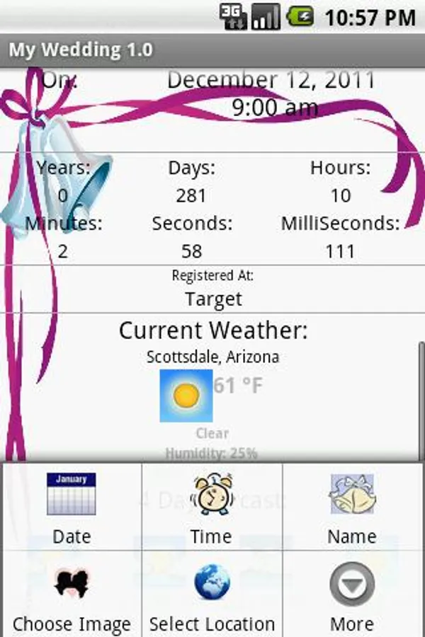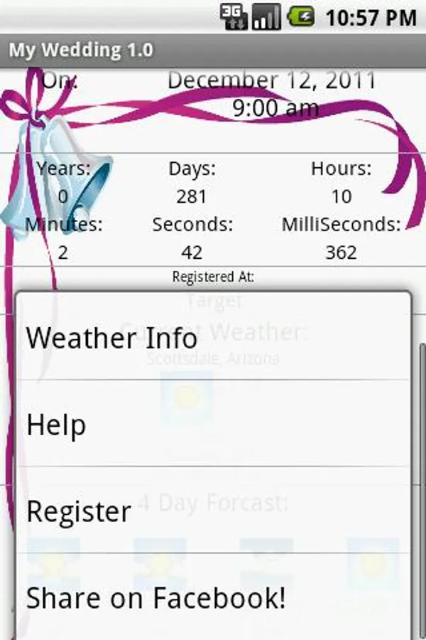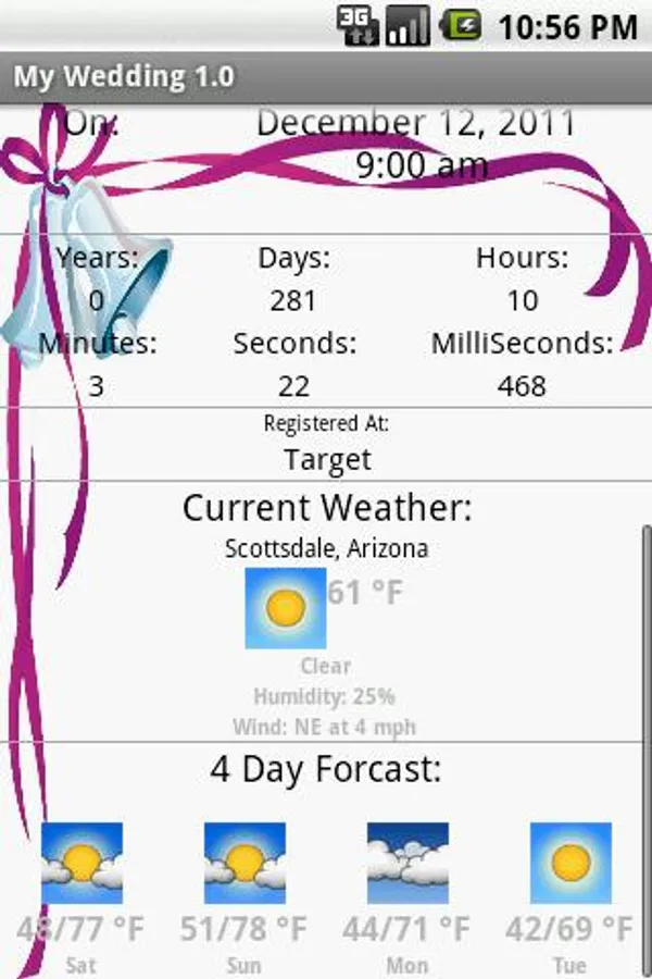 My Wedding helps you keep track of how many days left until you or someone you know is married. You can even enter the places you've registered for gifts and post the details on Facebook! You'll also get the current weather and 4 day forecast. This may help you quickly change an outdoor wedding to an indoor wedding/reception. We hope you find it useful. Please email me with suggestions to make the app better! Thanks!