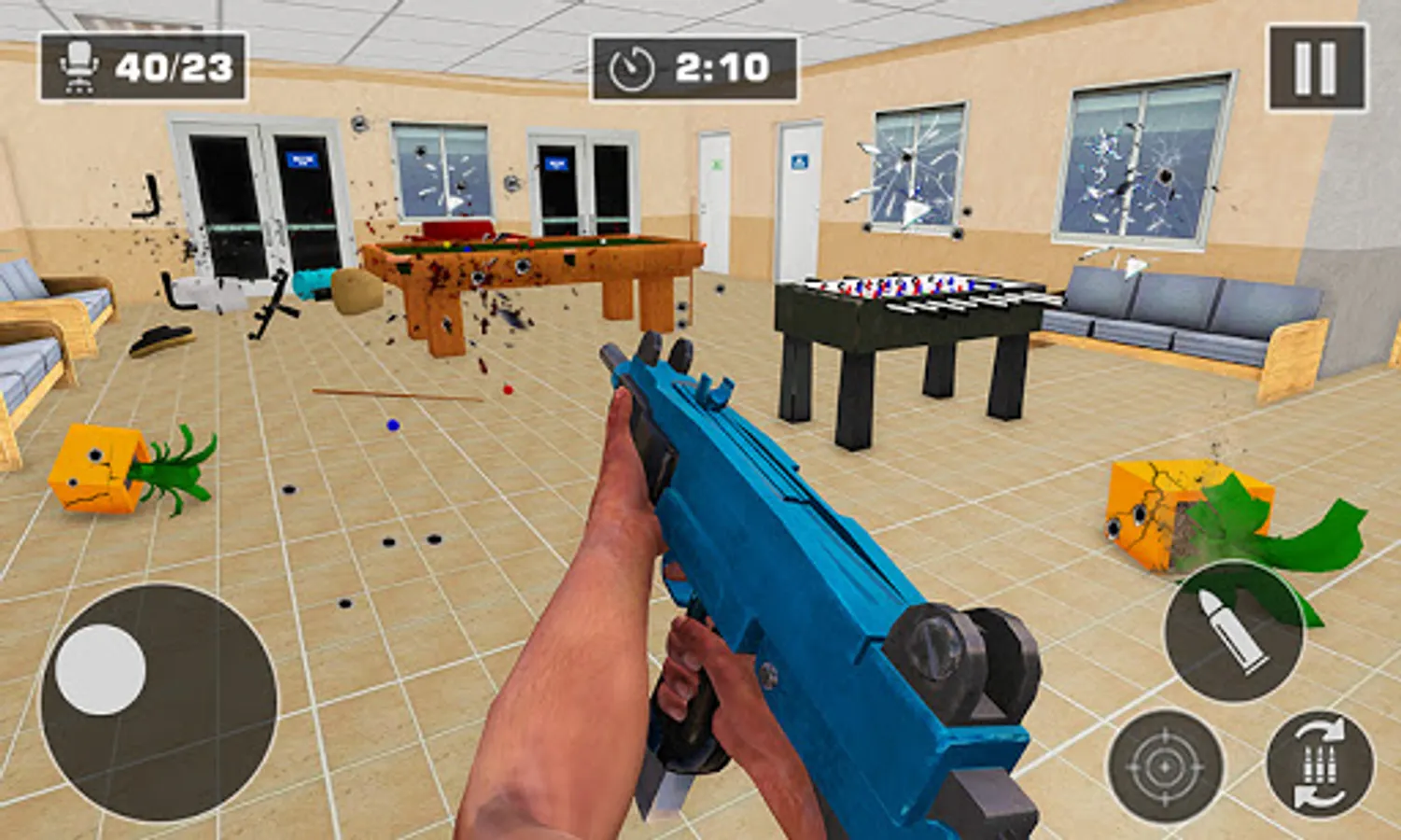 Your millionaire boss is on vacation with his family on his private beach. The office manager left you as office in charge with job to destroy the office so they can get it renovate with new furniture and interior. Trash tons of files and documents and let’s start destroying office. Get your nerve calm with most fun and addictive stress relief new shooting games. Get your hands on multiple firearms and ammunition to destroy office with best calming games for FREE. Forget the depression and anxiety and start smashing furniture, computer, table and area. The house builder will construct new office for the millionaire boss you job is to destroy office. Grab shotgun and pistol or you can use grenade and small machine gun to fire bullets and destroy office in best mind relaxation games.