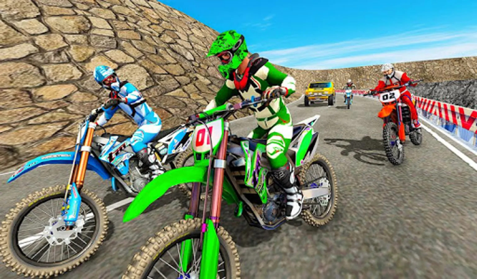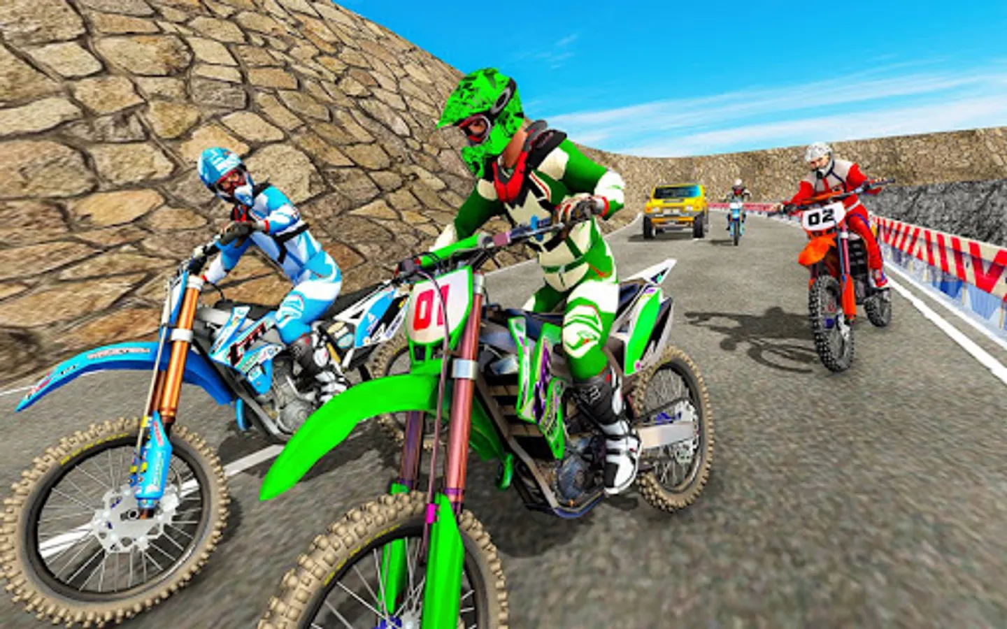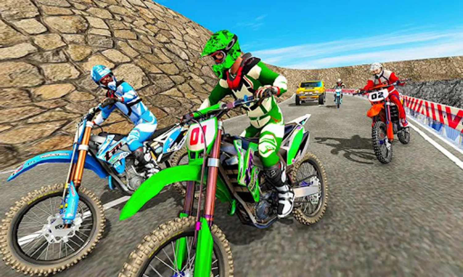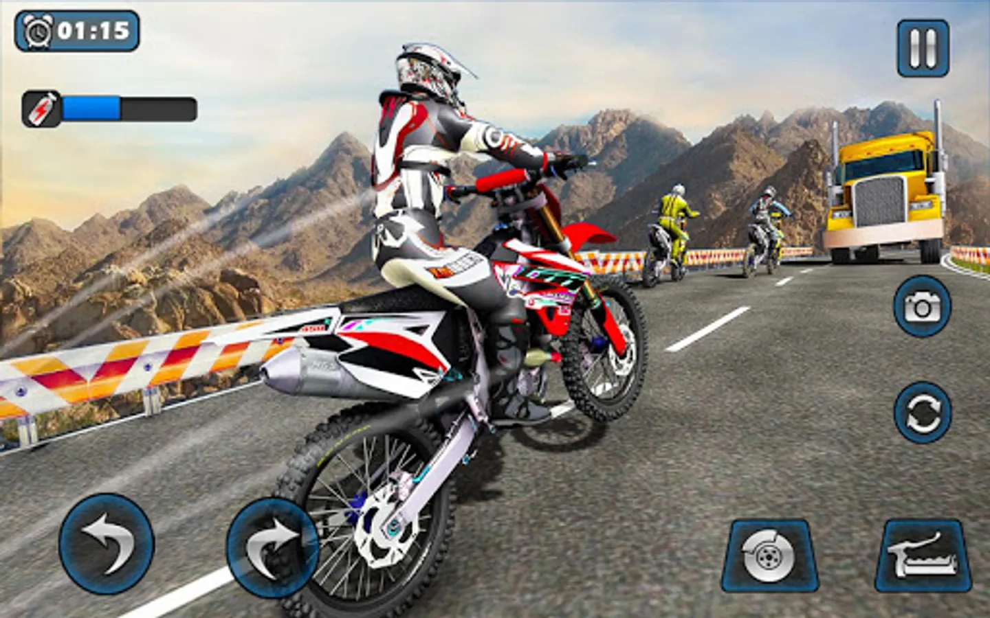 If you are a fan of freestyle motocross games, then play this stunning moto racer game and get the furious and fastest dirt bike racing experience. Play motocross racing on a trail bike and feel the thrill and rush of road bike racing it never ends. After the mountain biking game and participate in snow rally racing on trail bikes. Now ride in dirt bike races for free, and flip motorcycles over a speed bump on highway roads. Exhibit real stunt master skills in this mudding off-road motocross stunt hurdle game. After winning dirty track racing it's time to win on highway roads. Steer hard on zigzag tracks filled with traffic cars and twisty roads like trail bike drag races you can't come to the last position.