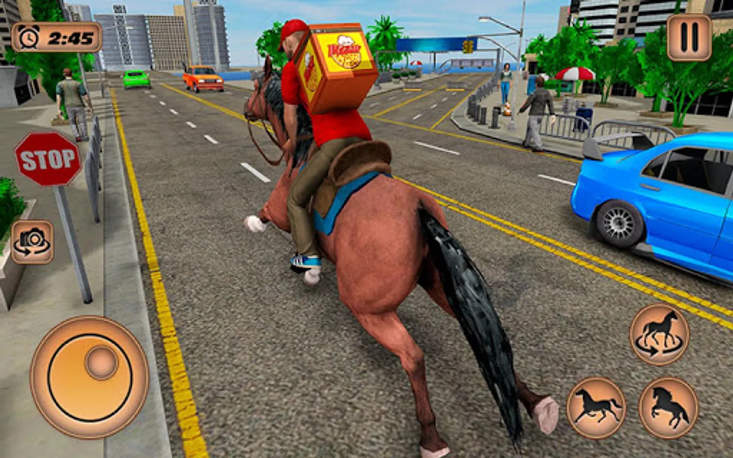 This pizza delivery horse rider simulator allows you to perform the roles of oven baked hot pizza delivery boy .Show some pro horse racing skills watch out for buses, sports cars heavy duty traffic vehicles in the real city.