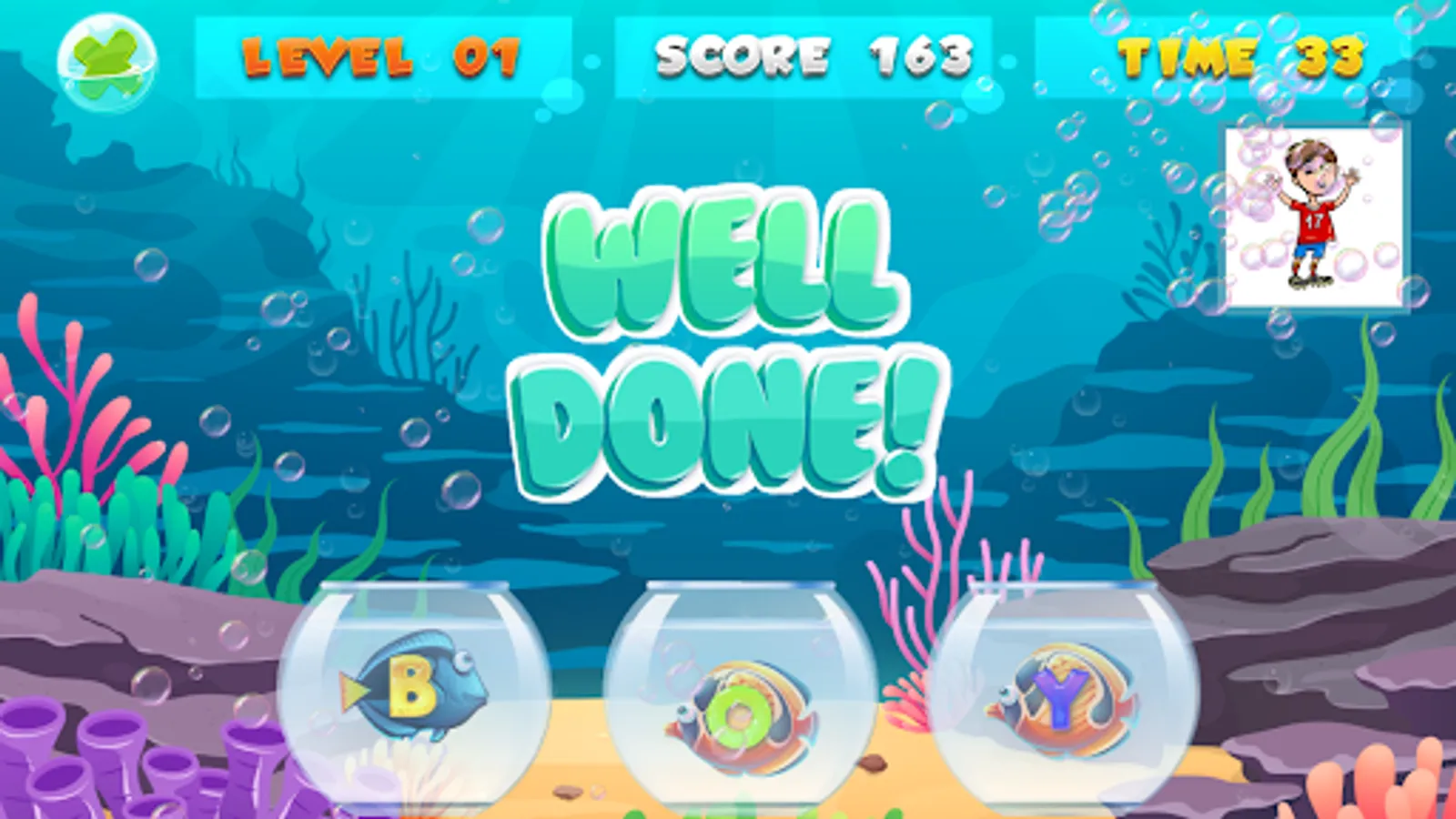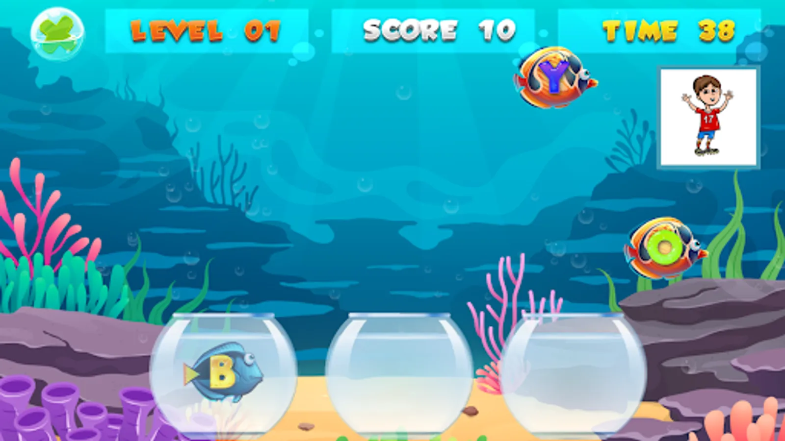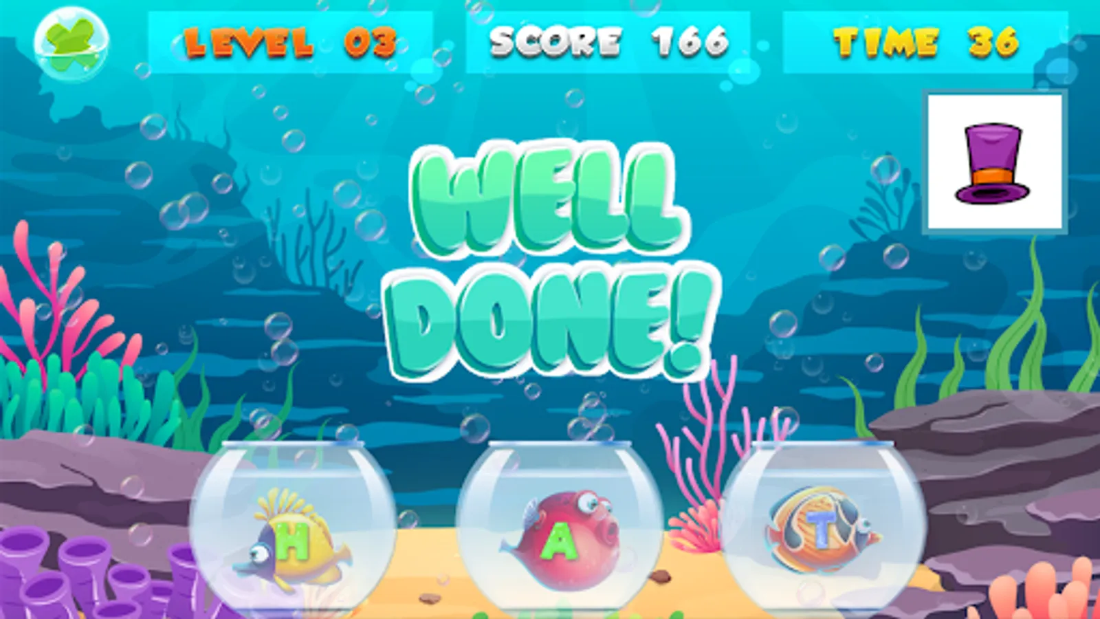 This game is an educational game. Drag and drop the correct fish (letter) into the correct fish tank to create the word before time out.