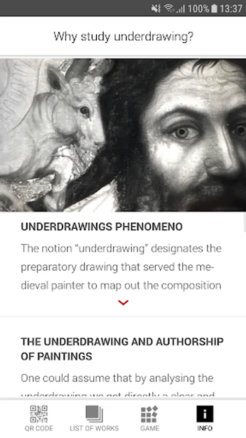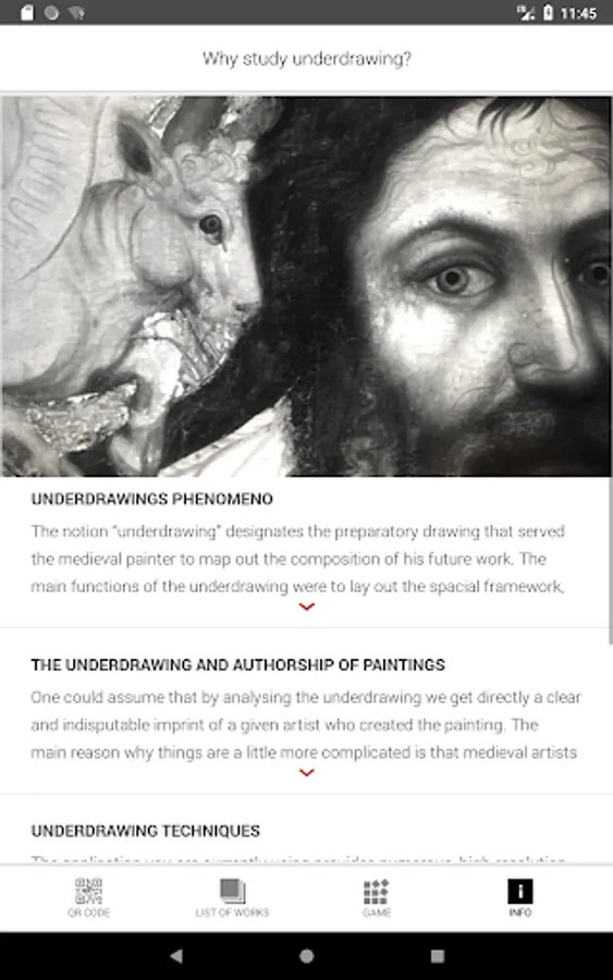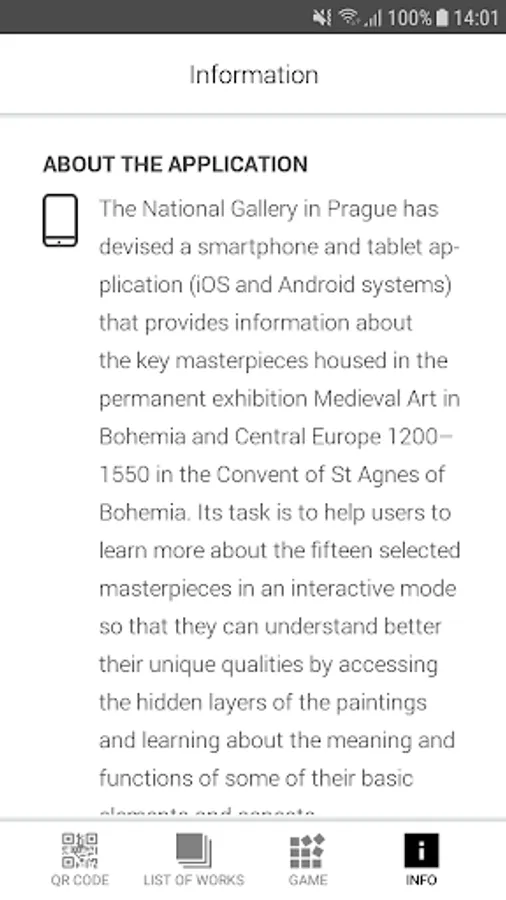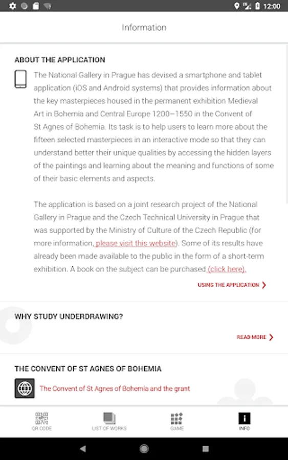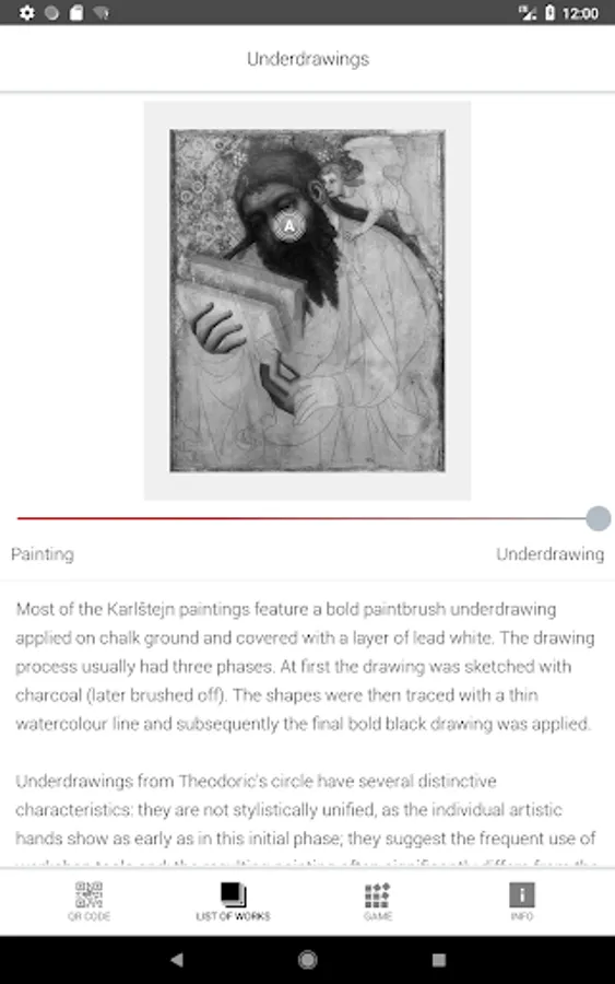 displayed in the collection of Medieval Art in Bohemia and Central Europe 1200–1550 that is located at Convent of St. Agnes of Bohemia. A number of pictures and comments will provide you with a lot of interesting information regarding the iconography and techniques of some key medieval panel paintings originating at the territory of the Czech lands. You will also learn about their authors and the process of their creation. IRR pictures will enable you to look into hidden layers of the artefacts that are not visible for the naked eye namely the underdrawing. The underdrawing represents a very important step in the process of creation of a given art work and tells us a lot about the interventions of all those who participated being members of medieval master's workshop. Everyone can examine some most interesting samples of the material that has been recently analysed by the researchers of the National Gallery. Moreover, the application will also show you (and comment upon) a large number of details that are visible but may escape the attention of viewers or are not so easy to understand nowadays.