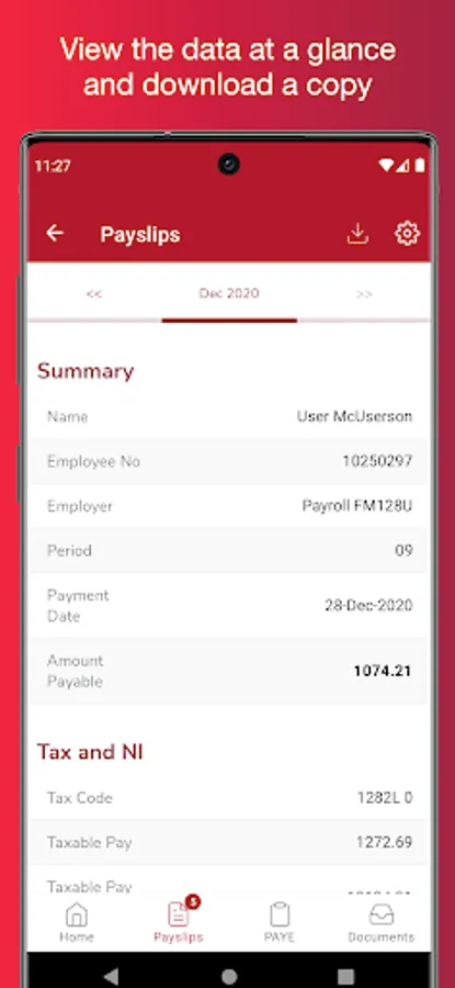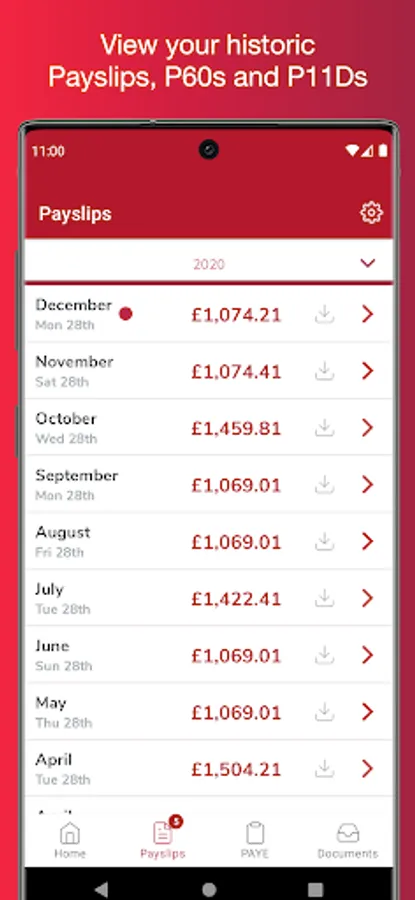• View current and historic payslips: The mobile application displays all current and historic payslip data that is available in the web application;