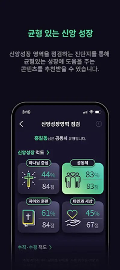 • Spiritual self-diagnosis test team: Spiritual self-diagnosis test function through the spiritual point check-up complex