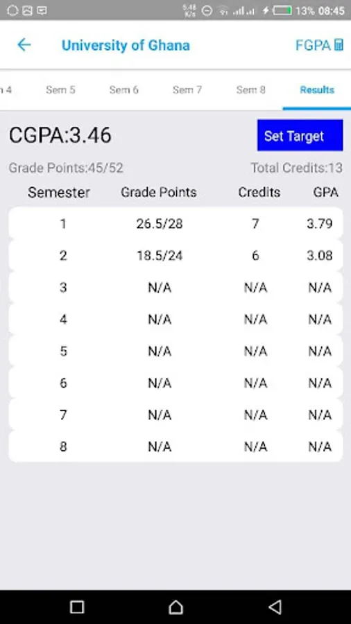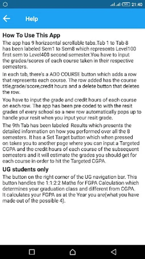 This app enables students from various tertiary institutions in Ghana calculate their CGPA&CWA and also enables them estimate the grades/scores they should get in subsequent semesters in order to hit a specific CGPA&CWA.