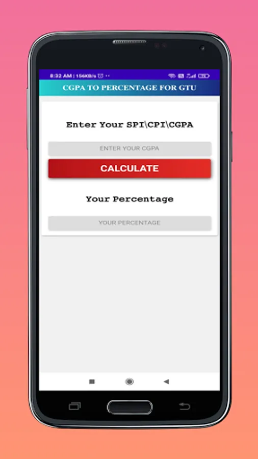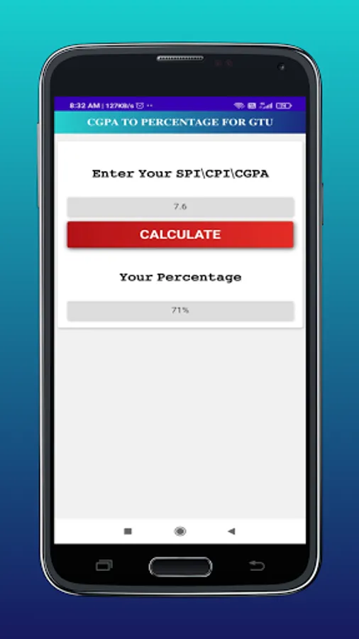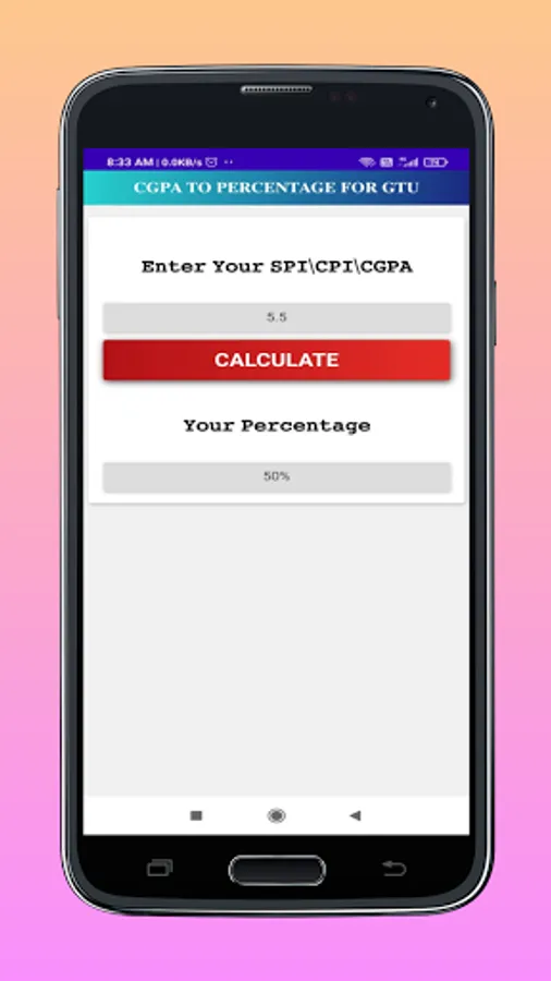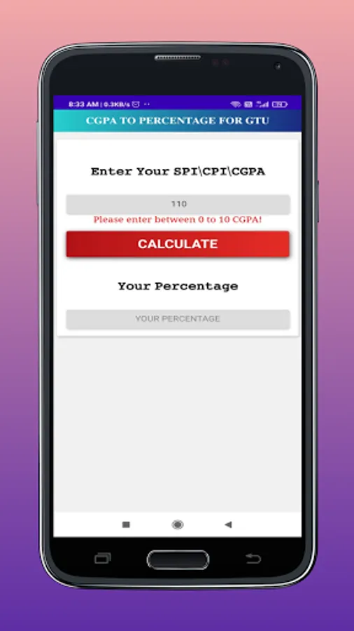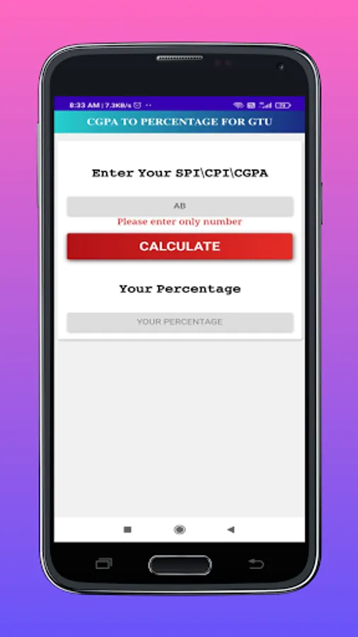 Using this App is a very easy , only thing you have to do that just insert or type your SPI/CGPA/CPI on the input box.Now the only thing you have to do that just click on Calculate, Then You will Get Your Percentage.