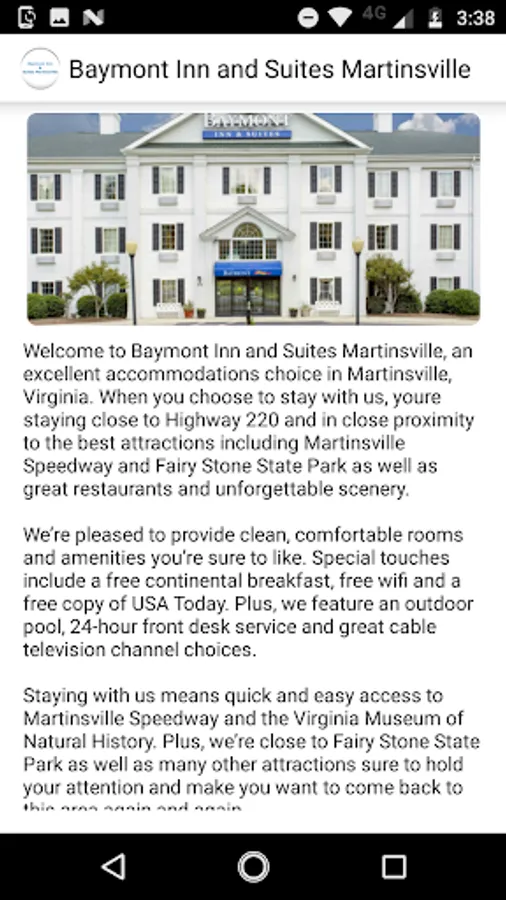 Interested in Baymont Inn and Suites Martinsville? You will be when you take a look at what a great place to stay this hotel is. Book quickly and get the best possible rates using this single property app powered by BingoTravel Apps. Access complete details about this hotel on your smart phone. Hotel features and amenities are presented along with photos you’ll enjoy viewing. This direct connection with the hotel is all you need to reach this property and get the best deal on a room for one night or many. Download the app right away.
