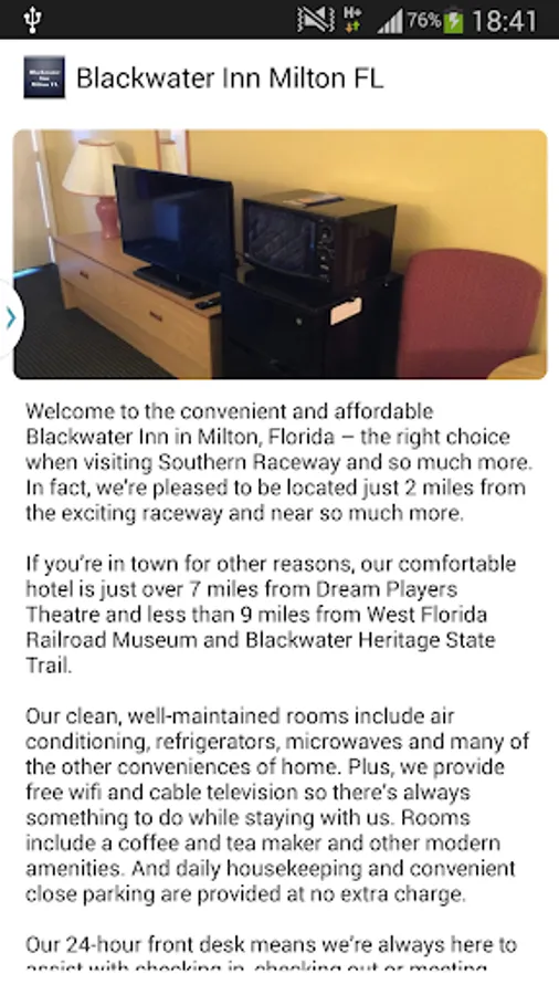 With the BingoTravel App designed especially for the Blackwater Inn Milton Hotel in Milton, FL. you can book this hotel easier than ever before from your smart phone. This user-friendly single property app is both useful and powerful, giving you quick direct access to this hotel. Download the app and get immediate access to amenities and features as well as convincing and enticing photos. Booking is a snap, and so is getting the very best deal. Your direct connection and round-the-clock access makes downloading this app now truly worthwhile. Why wait to download it?