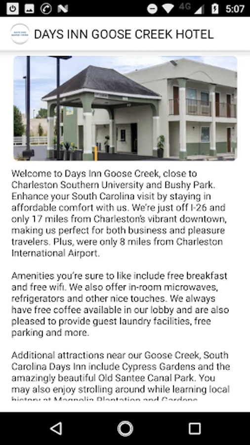 Book DAYS INN GOOSE CREEK HOTEL quicker and easier than ever before. With the hotel’s app powered by BingoTravel Apps, connecting with this property directly and simply has never been more convenient. Do everything you need on your smart phone! This single property app lets you take a look at hotel features and amenities and glimpse useful photos -- anytime you want. And of course, you can book directly with this powerful application. Even better, do things around the clock without waiting on hold or dealing with a call center. To connect with this hotel now, download this app.