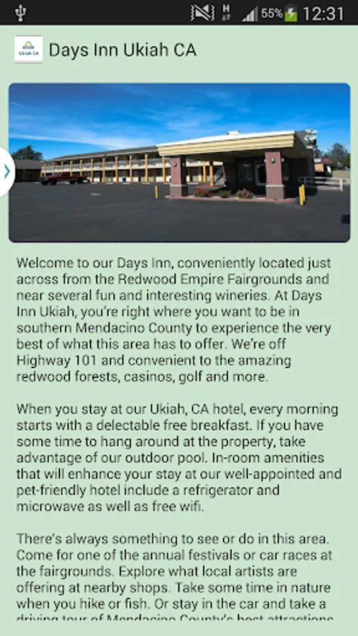 For the very best value in Ukiah CA, it’s the Days Inn Ukiah CA Hotel, a clean, comfortable hotel you’ll like from the very first moment. You can connect with this hotel easier and more conveniently than ever before using this single property app from Bingo Travel Apps. Booking is simpler than you ever thought possible -- right from your smart phone! You can also read over features and amenities and see accurate, convincing photos of this property as well. With this app, the hotel is always at your fingertips -- and always available at the best possible price. Download the app right away.