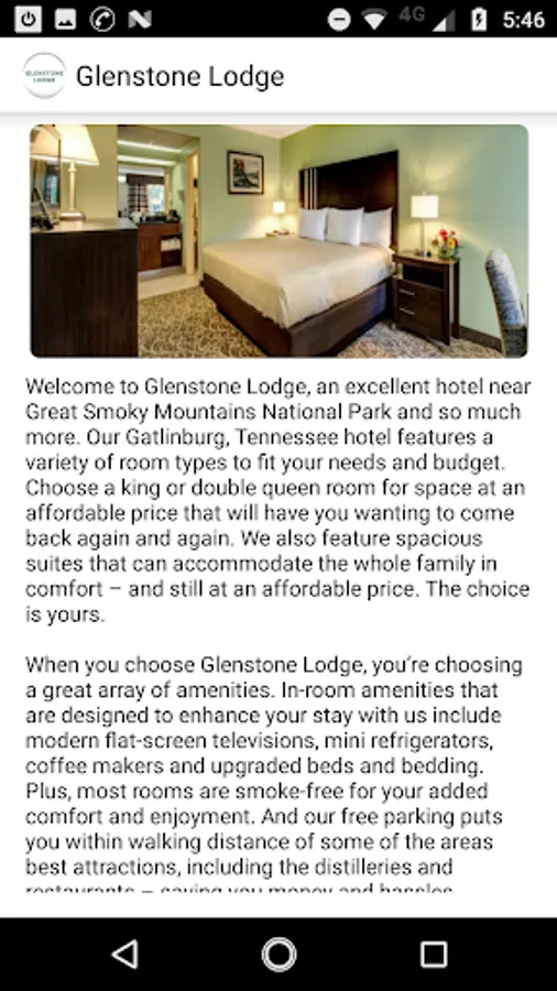 Glenstone Lodge is waiting for you! Book this hotel with greater ease and quicker than ever before. And do everything right from you phone! With this single property app brought to you by BingoTravel Apps you can examine hotel features, view hotel amenities and look at hotel photos -- whenever you want. And for booking, there’s no easier way to get the best rate. Even better, the app is always here for you and means you never have to wait on hold again. Download the app for this hotel and see how easy hotel booking can be.