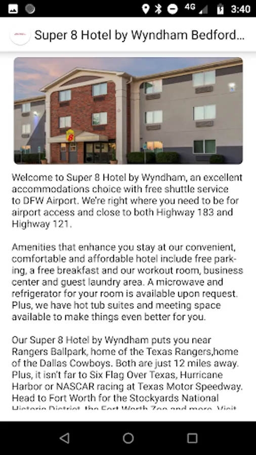 Book Super 8 Hotel by Wyndham Bedford TX quicker and easier than ever before. With the hotel’s app powered by BingoTravel Apps, connecting with this property directly and simply has never been more convenient. Do everything you need on your smart phone! This single property app lets you take a look at hotel features and amenities and glimpse useful photos -- anytime you want. And of course, you can book directly with this powerful application. Even better, do things around the clock without waiting on hold or dealing with a call center. To connect with this hotel now, download this app.