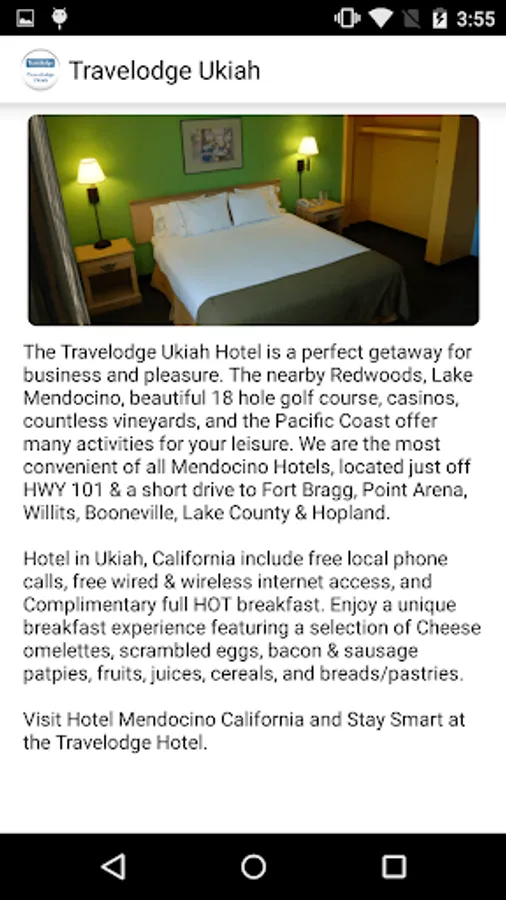 The Travelodge Ukiah hotel in Ukiah, CA is waiting for you! Book this hotel with greater ease and quicker than ever before. And do everything right from you phone! With this single property app brought to you by BingoTravel Apps you can examine hotel features, view hotel amenities and look at hotel photos -- whenever you want. And for booking, there’s no easier way to get the best rate. Even better, the app is always here for you and means you never have to wait on hold again. Download the app for this hotel and see how easy hotel booking can be.