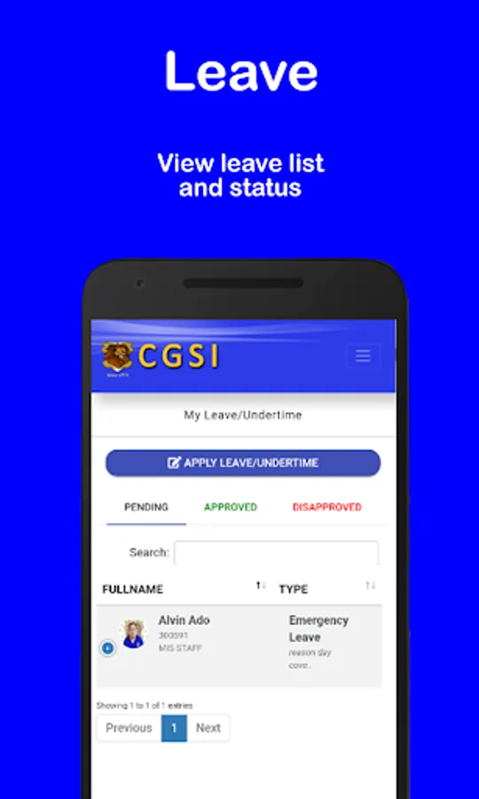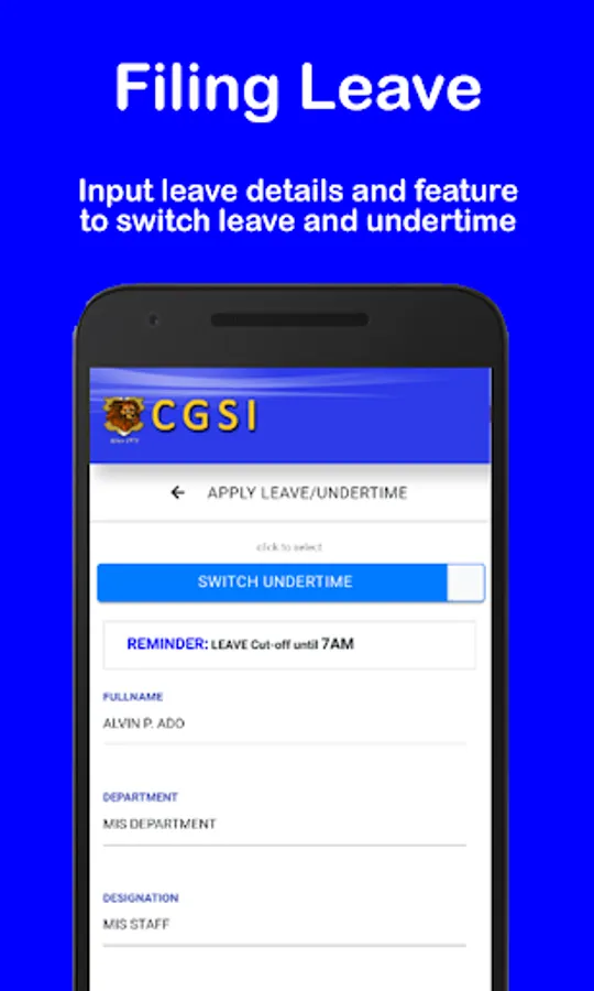 is a mobile application intended for Cebu General Services, Inc. members which enables them to apply leave online and access other features included in the platform. In addition, this application allows paperless transaction which aimed by the company.