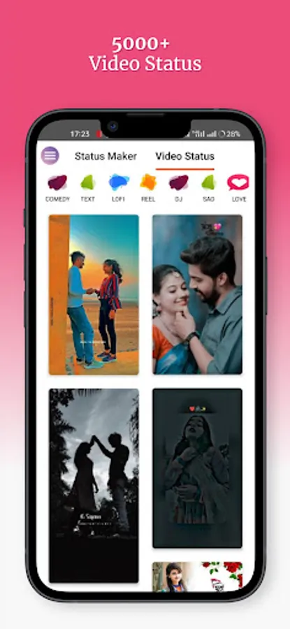There are 5000+ Video Status in CG PiX App . You can easyly share you Favoties Status On Social . Many Catagory Available like Love , Sad , Dj , Reels , Comdey , Text , Romantic etc.