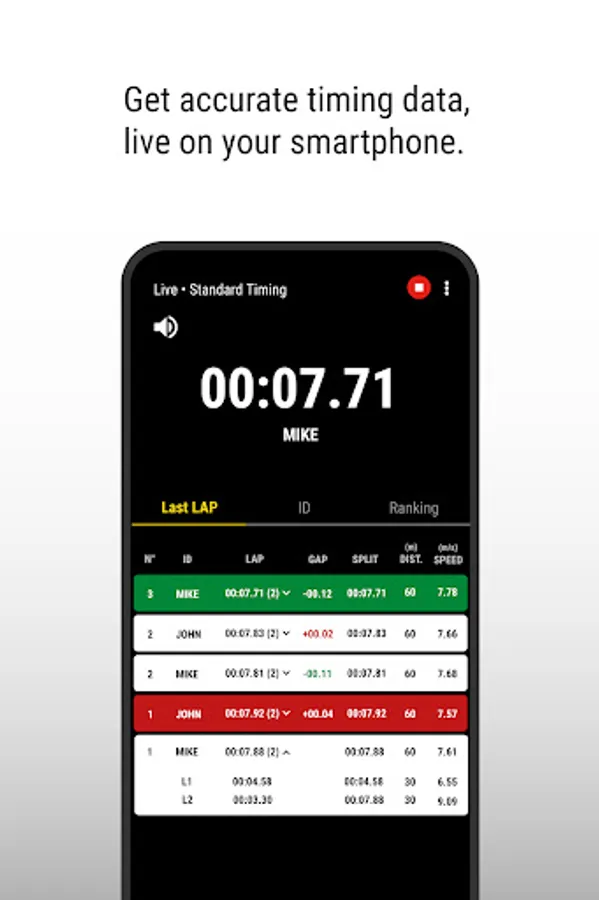 • Get complete data: LAP time, Intermediate LAP time, SPLIT time, Best time, Slowest time, Rest time, Time Gap, Distance, Speed, Heart Rate, Ranking…