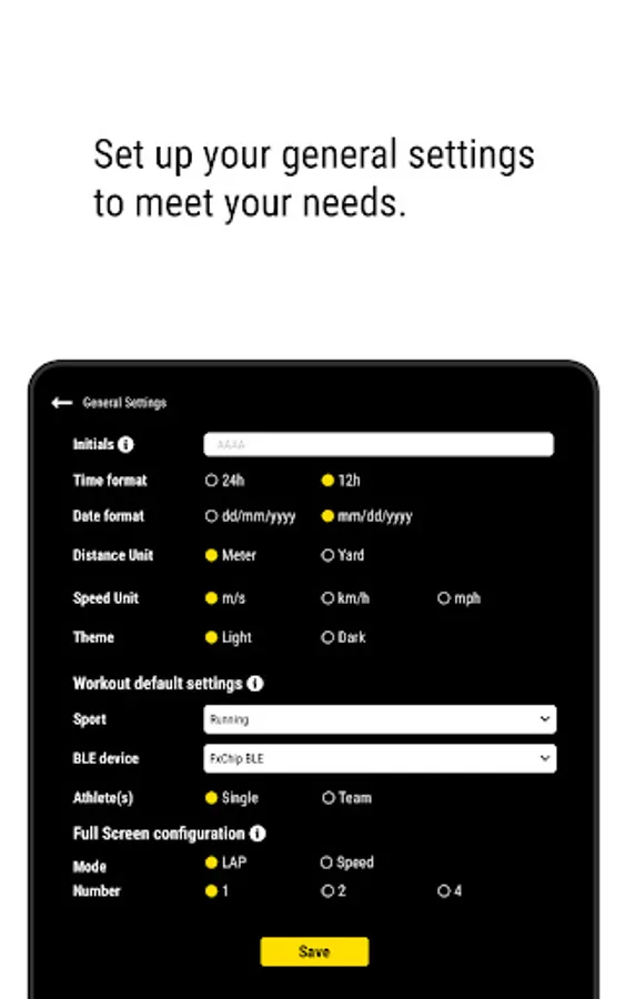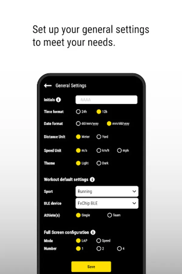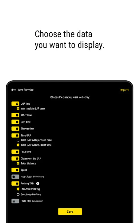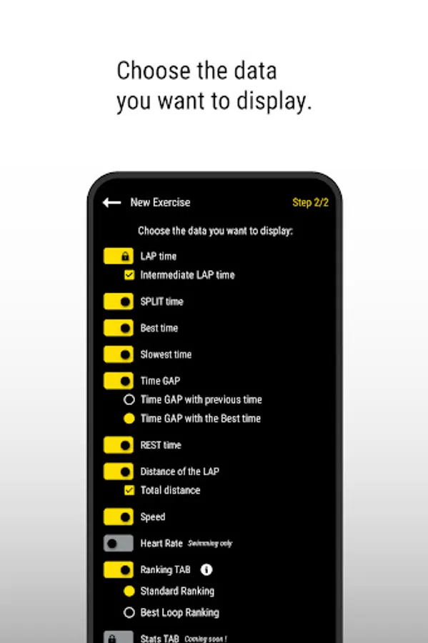 • Create your own Exercises: To choose your timing mode, enter distances to get your speed and customize the data you want to display.