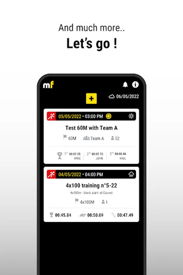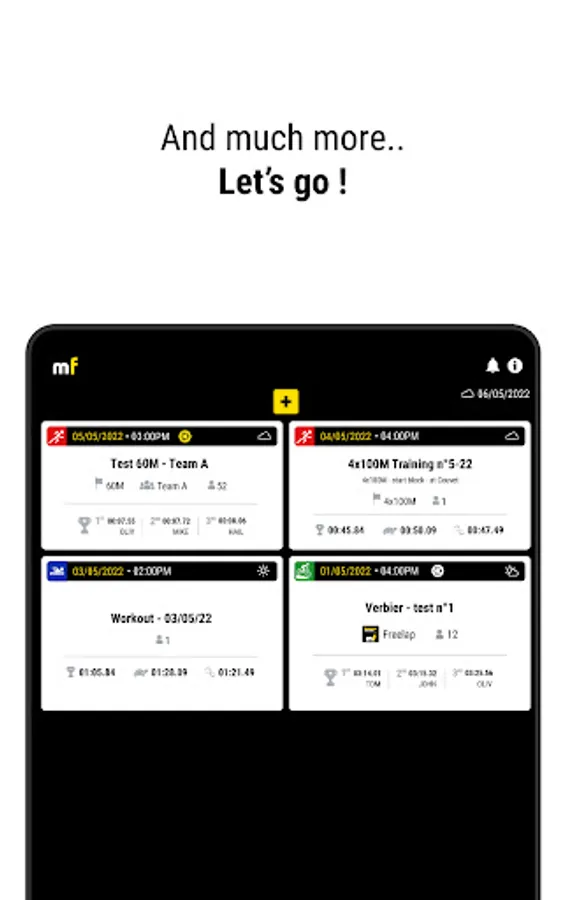 • The essential at a glance: On the Workouts list, the overview of your Workout displays: For Single Workout: Best time - Slowest time - Average time / For Team Workout: the 3 best times.