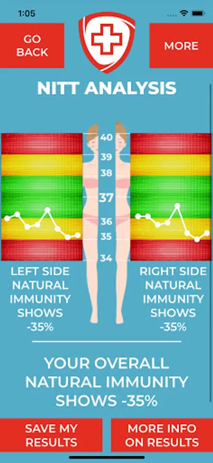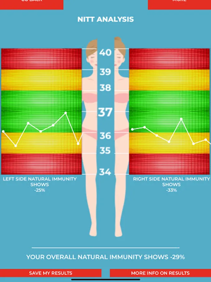 However, if the body temperature falls below 36C, unwanted symptoms and disorders begin. With the NITT app, you can graphically display an analysis of whether your natural immunity has decreased at any time, based on body temperature measurements at various points on the body.