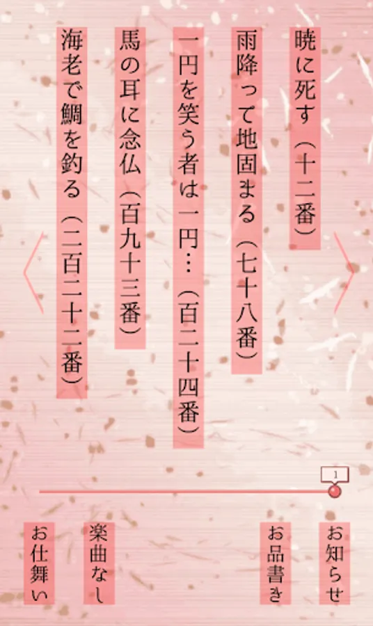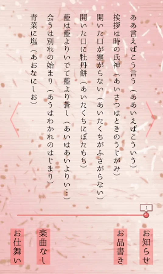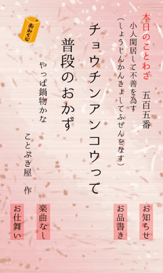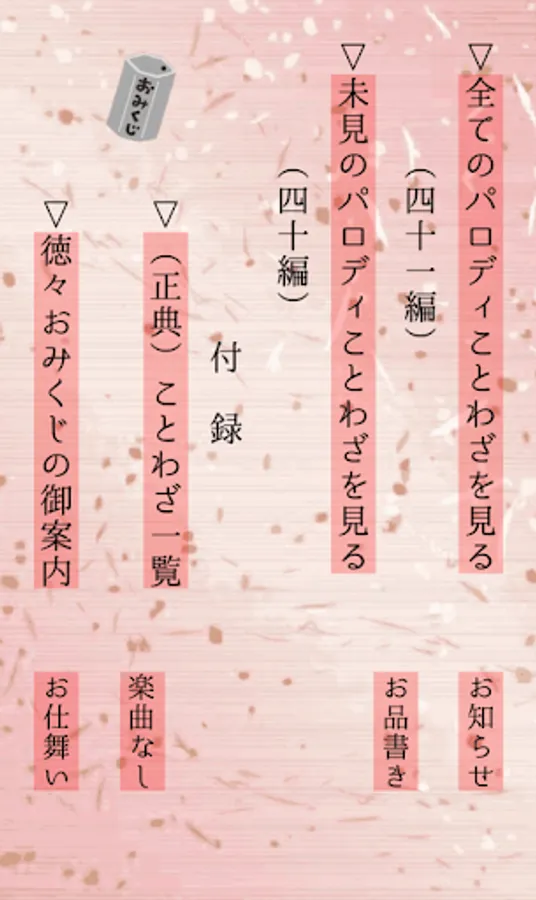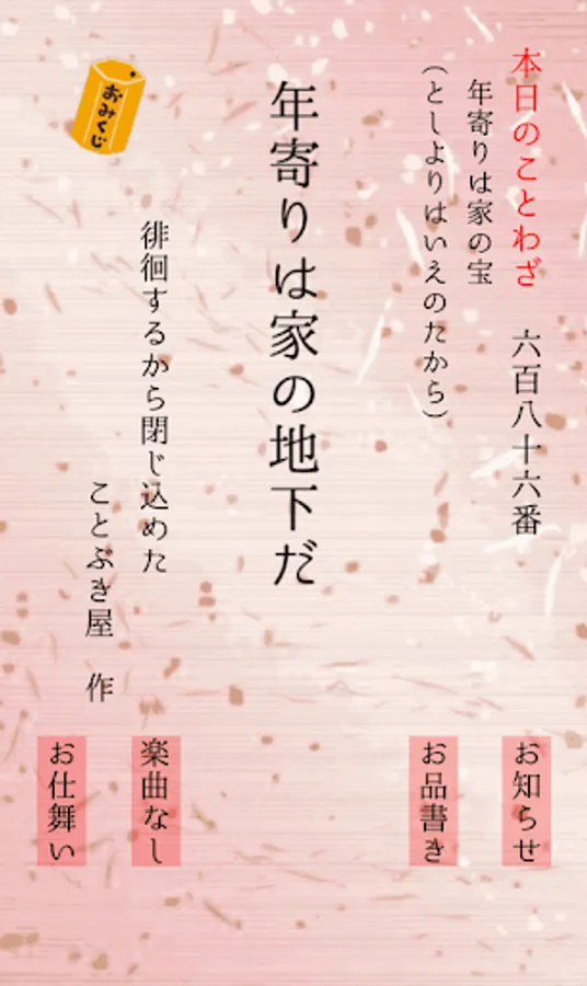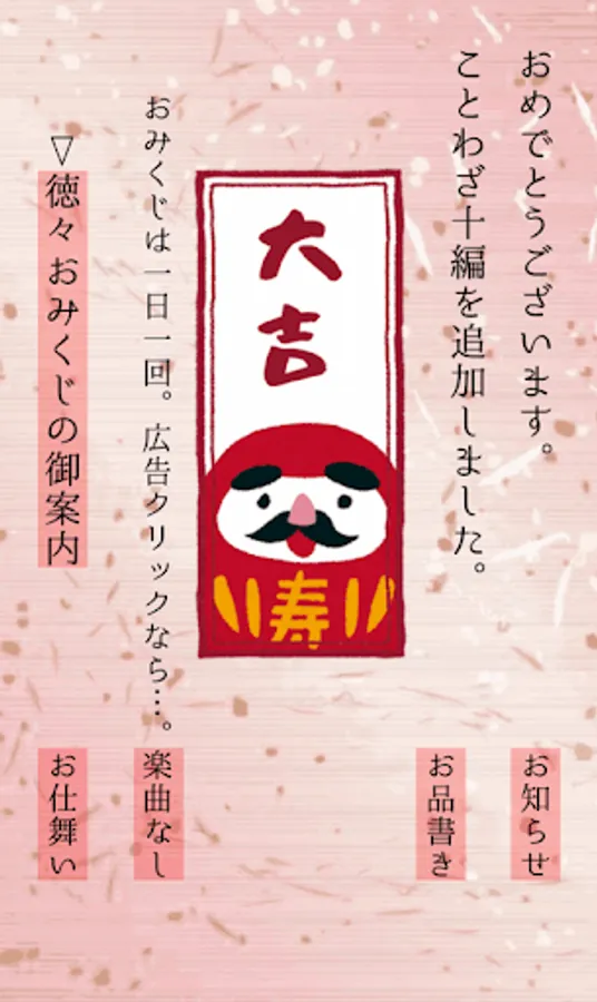 In addition to the initial 30 volumes, 1 volume will be added to the display list every day as "Today's proverb", and 1 to 10 volumes will be added to the display list depending on the result of "Omikuji".