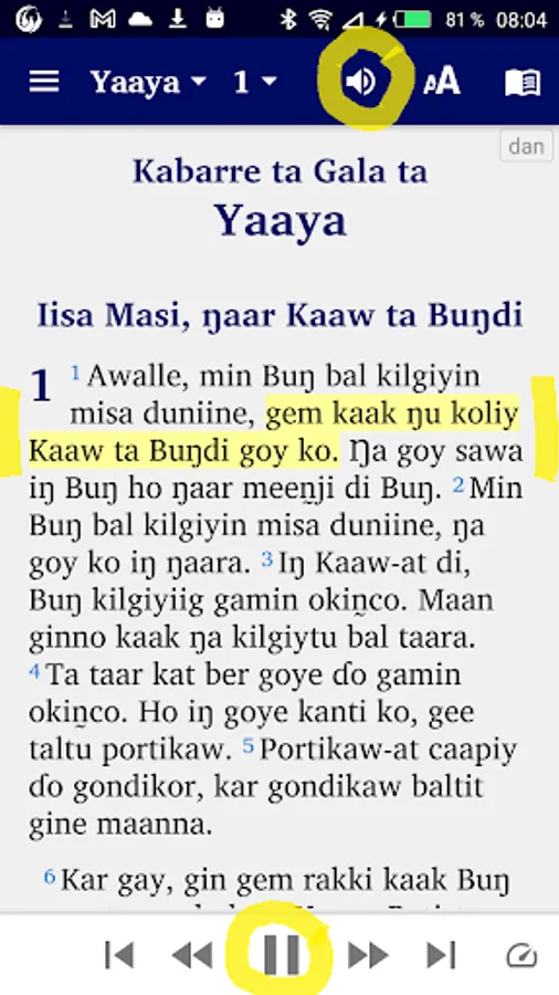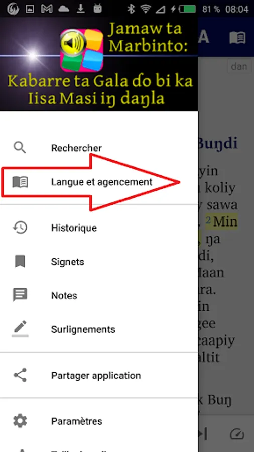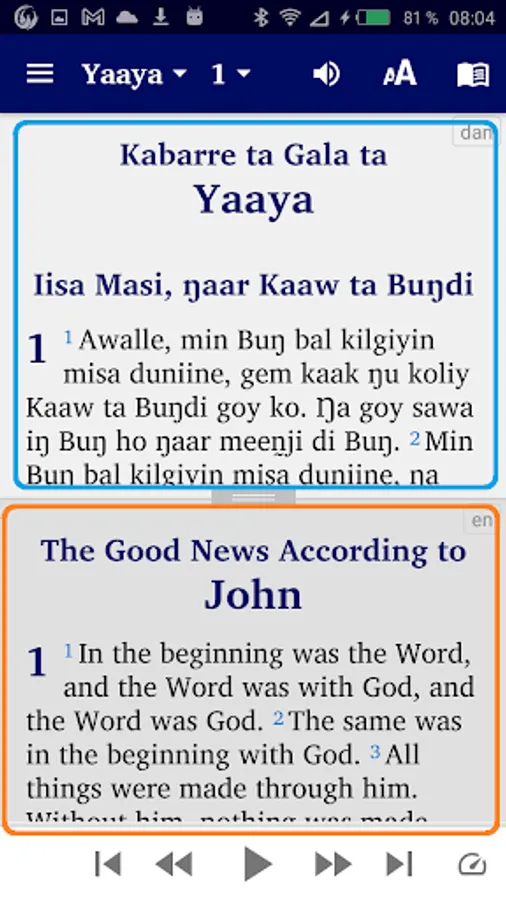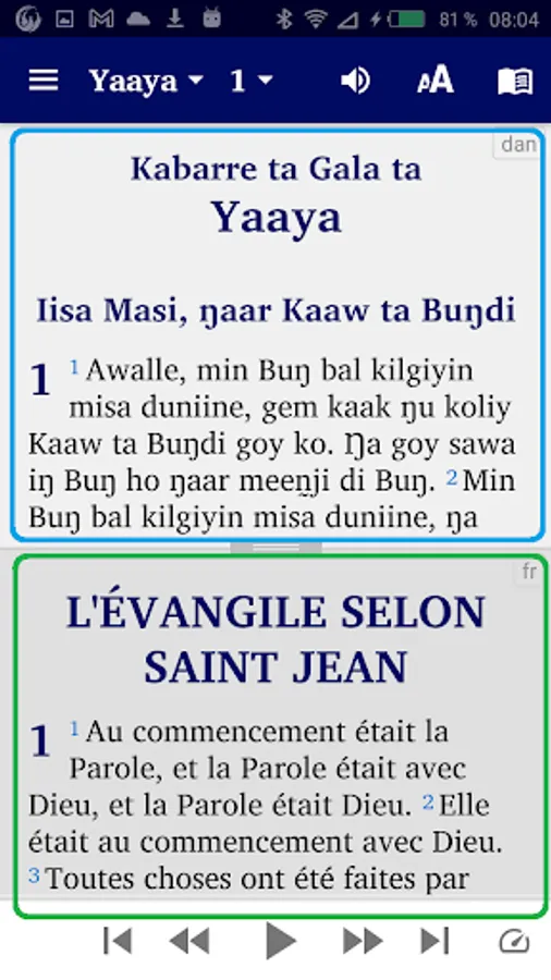 - «verset par verset» pour afficher un verset en Dangaléat suivi du même verset en français ou en anglais.