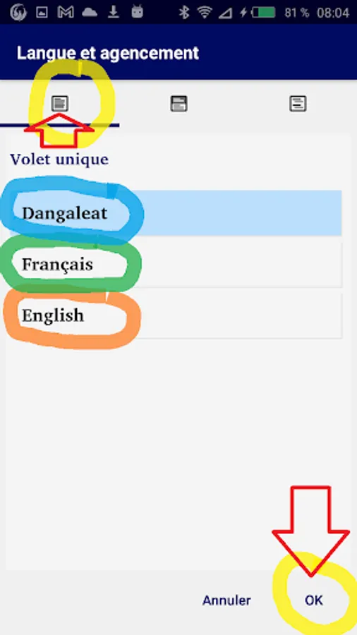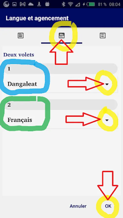 - «deux volets» pour afficher le Dangaléat en haut et parallèlement la version française ou anglaise en bas