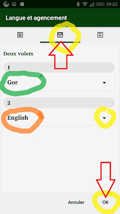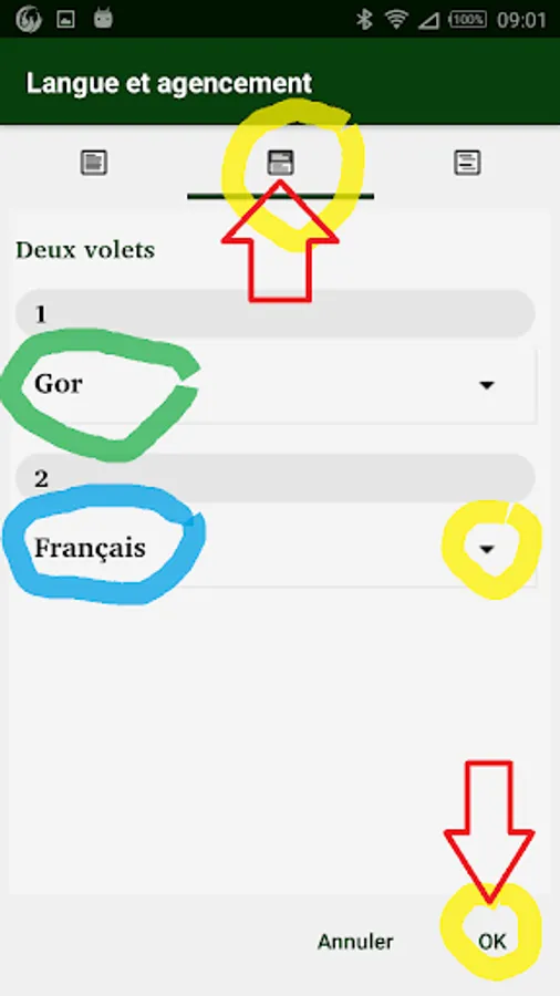 - "two panes" to display the Gor at the top and the French or English version at the bottom