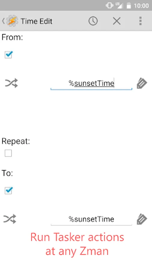 - Make a new Tasker profile with the time context and set the time to the variable you created