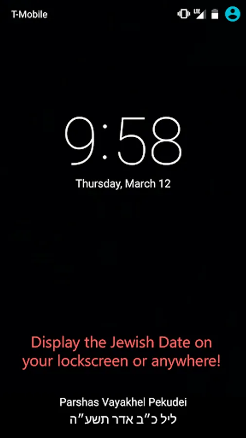 - Display the Jewish Date on your lock screen or launcher using DashClock (https://play.google.com/store/apps/details?id=net.nurik.roman.dashclock) with DashClock Tasker Extension (https://play.google.com/store/apps/details?id=de.schluderer.apps.t2d).