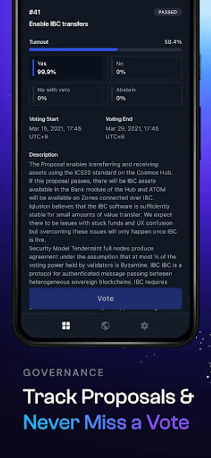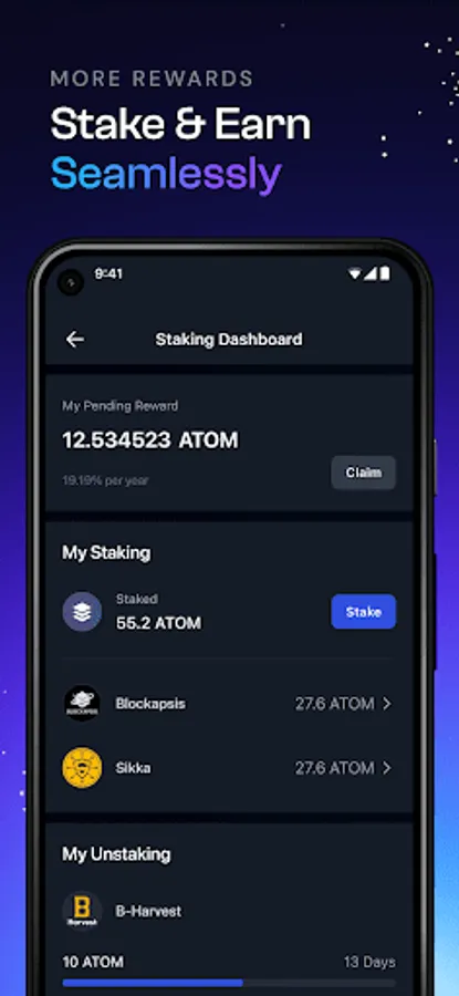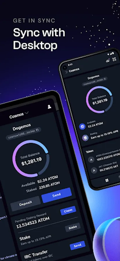 Explore the world of interoperable blockchain applications in the Cosmos ecosystem and beyond, with multichain support and activity from over 100k global users. From the convenience of your mobile device, you can stake tokens, manage earnings, participate in governance, and connect to DeFi applications all in one place.